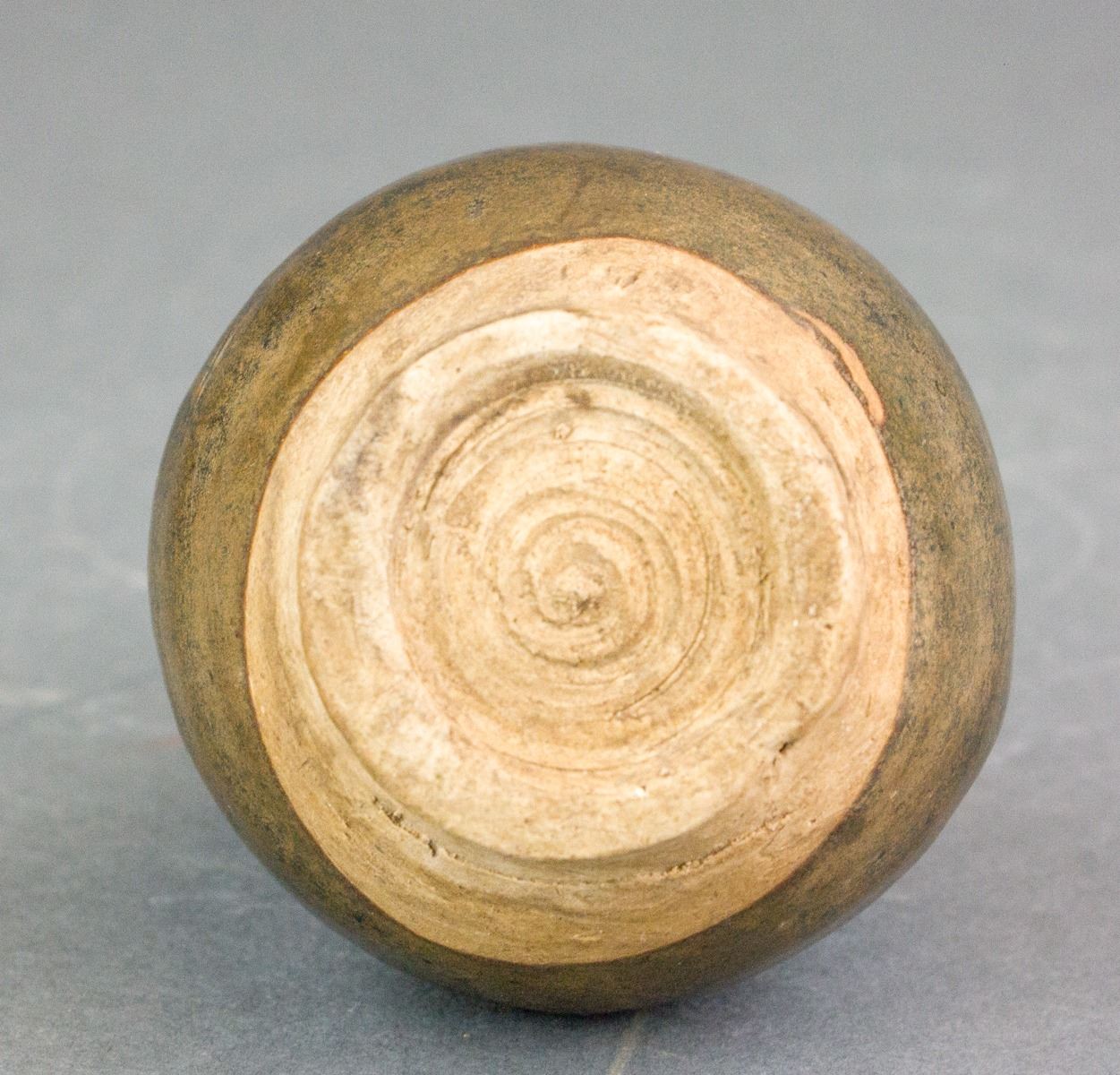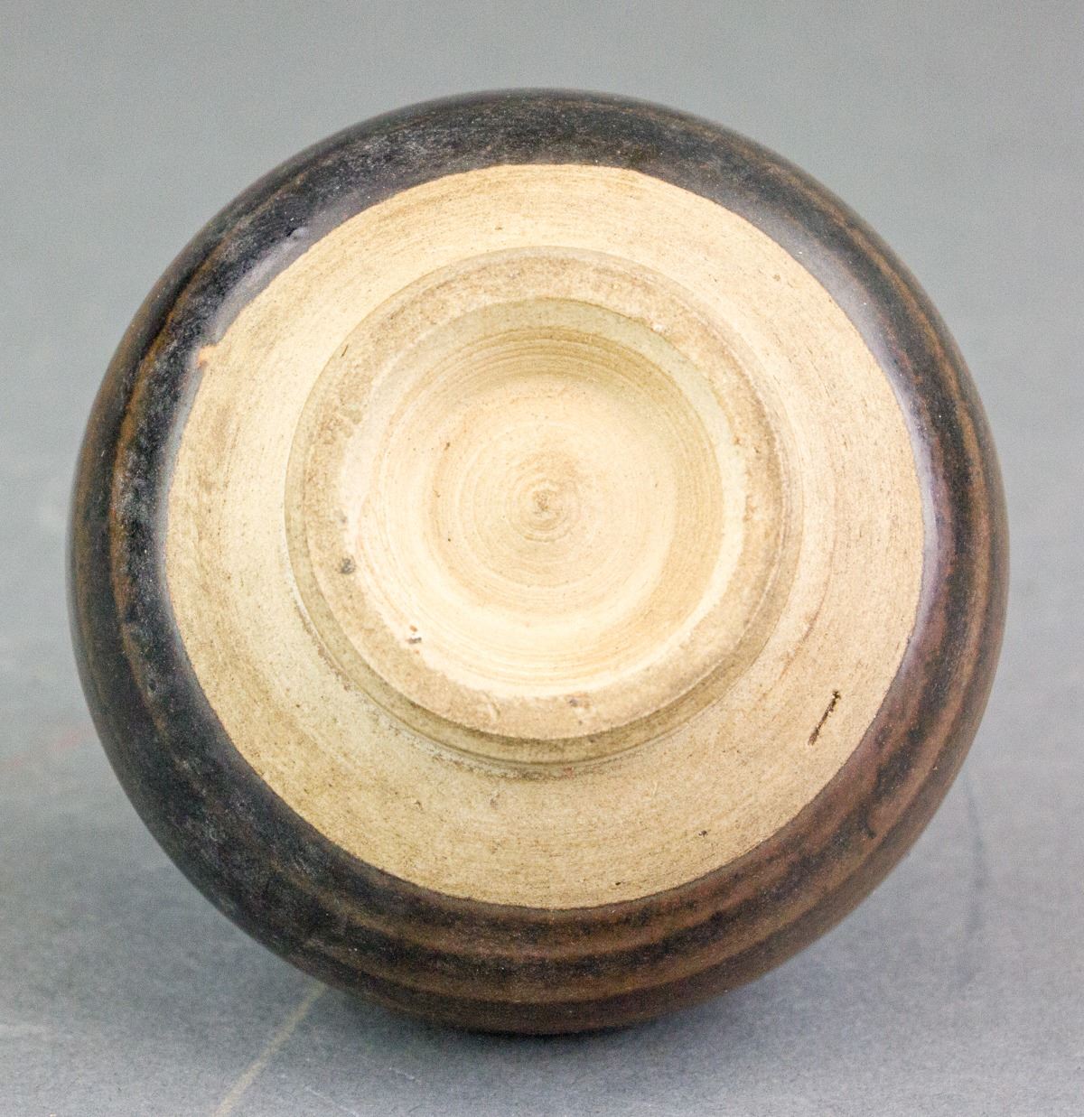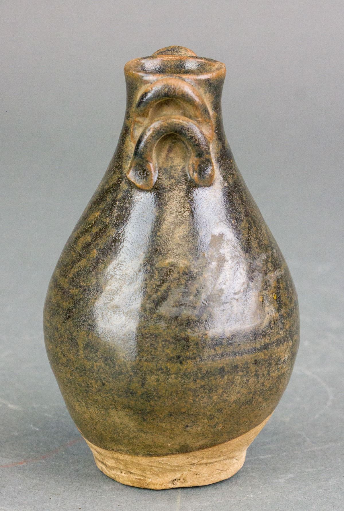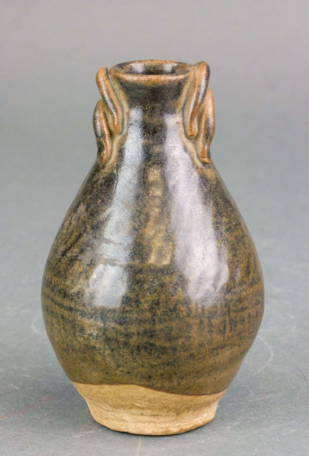 Two pieces of Tang style pottery jars; comprised of one pear-shaped jar and one globular jar; both set with loop handles on mouth rim; covered in dark brown glaze; H: 8.5-10 cm, W: 6-7.5 cm, 282 grams total