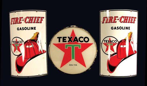 Two Texaco Porcelain Signs one with minor touch up the other mint 10 1/2 X 18 inches and Glass Globe Insert, no chips or cracks, 13 1/2 inch diameter.