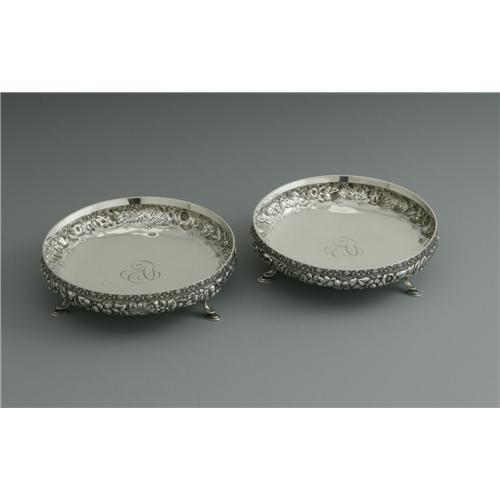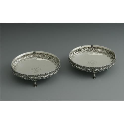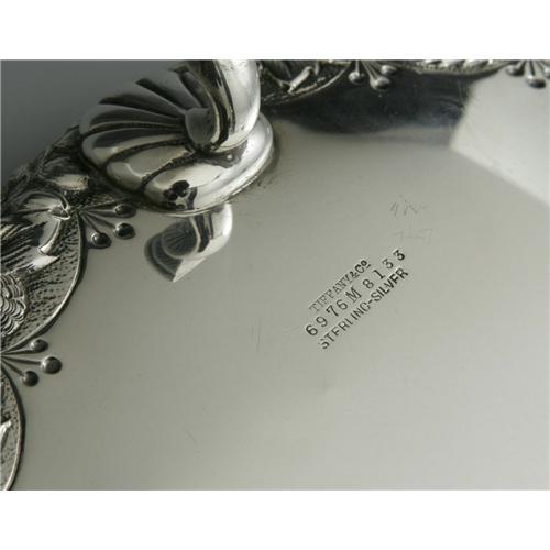 <B>Two American Silver Compotes</B></I><BR>Tiffany & Co., New York, NY, 1882<BR><BR>The floral repousse compotes raised on three legs, script monogram to the center <I>AJ,</B></I> marked underside <I>TIFFANY & CO./6976 M 8133/STERLING-SILVER,</B></I> total weight 14.1 Troy ounces<BR>1.7in. high x 6.1in. diameter
