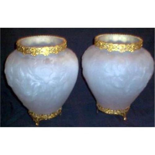 We are offering you a pair or two (2) stunning Tiffin Elegant Depression Glass Vases all for one money. Each vase is molded with the Tiffin Poppy and each one has a brass collar at the neck and brass feet. Both vases are in SUPERIOR condition with no chips, cracks, or dings and they each measure about 8.50" in diameter at their wides point and stand a very stately 9.75" tall. Don't let these unusual vases pass you by as they are becoming quite difficult to find in this excellent condition.