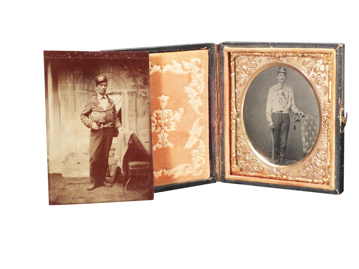 Lot of Two Tin Types 1/6 plate of fireman in uniform. One in paper mache case. Aprox 2 1/2 X 3 1/2 inches.
