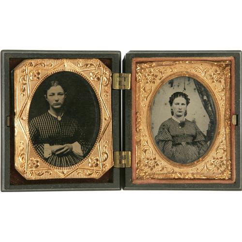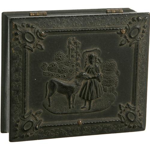 <B>Two Tintypes of Young Girls, One Cased.</B></I> This is a lot of two tintypes of a young girls. One tintype is in a scarce "Mary had a little lamb" gutta-percha Union case (Krainik # 384). The case is in good condition (one corner is chipped). There is some minor scratches above the image and some spotting, otherwise a clean piece. Condition of the tintype is very good. Dimensions: Photo: 1.5" x 2", overall with case open: 4.75" x 3"; and, a another tintype with only an embossed brass mat. The photo is in very good condition. Dimensions: Photo: 1.5" x 2" ", overall with mat: 2" x 2.5".<BR><BR><b>Shipping:</b> Miscellaneous Collectibles, Smal (<a target="_blank" href="http://www.heritageauctions.com/common/shipping.php">view shipping information</a>)