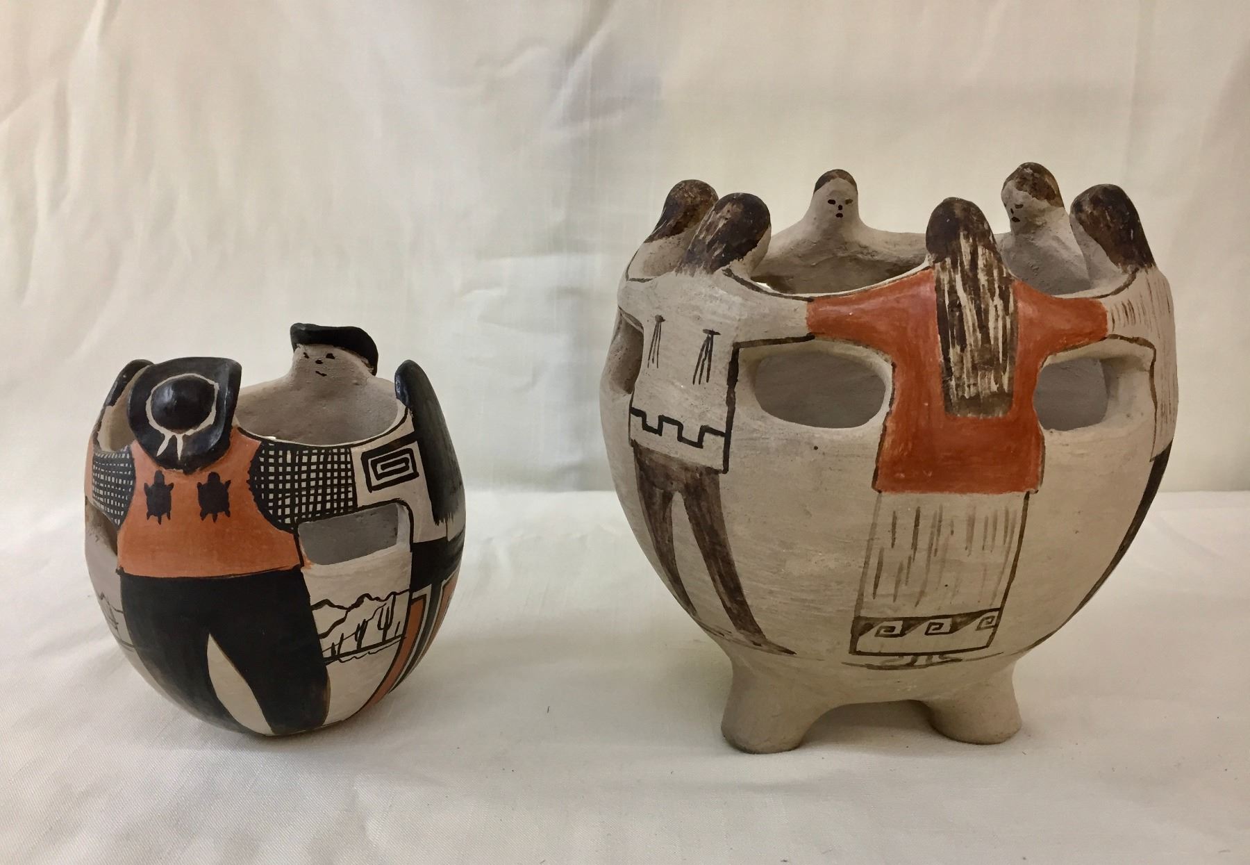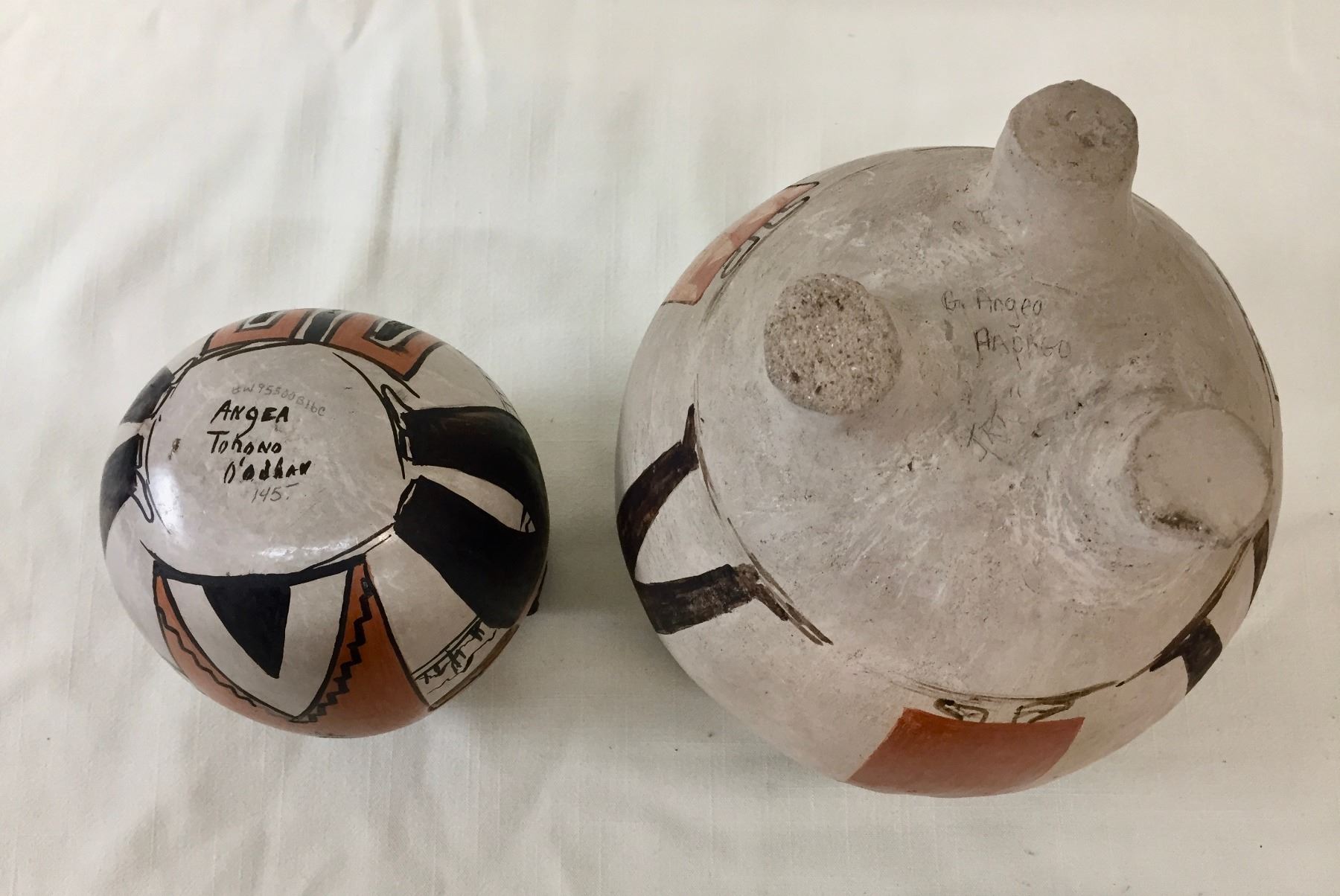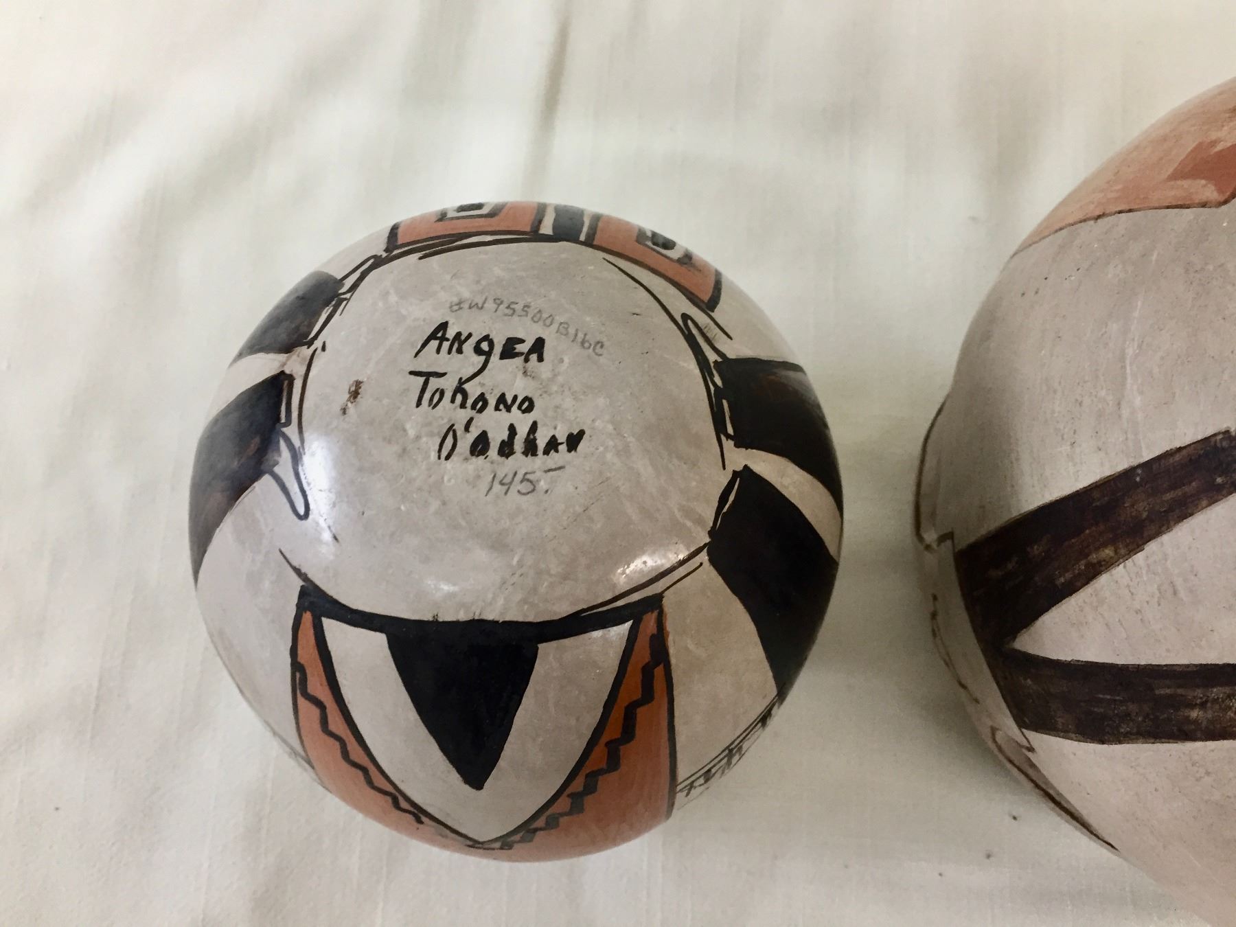 Description: Offered for sale in this lot are two original, Angea family, Tohono O’Odham Friendship pots in excellent vintage condition with minor wear. Signed on bottom. Maker: Rupert Angea (who is now in his 80s) and his sister, Gladys Angea. Approx. Age: Vintage. Size: 7-1/4”w x 7” tall and 5” w x 5-3/8” tall. Condition: Good for their age, normal wear expected. Please look closely at the pictures - they are an important part of our description. Shipping: There will be a $10 handling / packaging fee for shipping this lot. The actual cost of postage will be added on top of that.