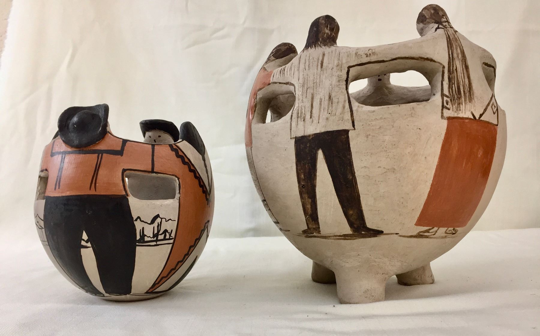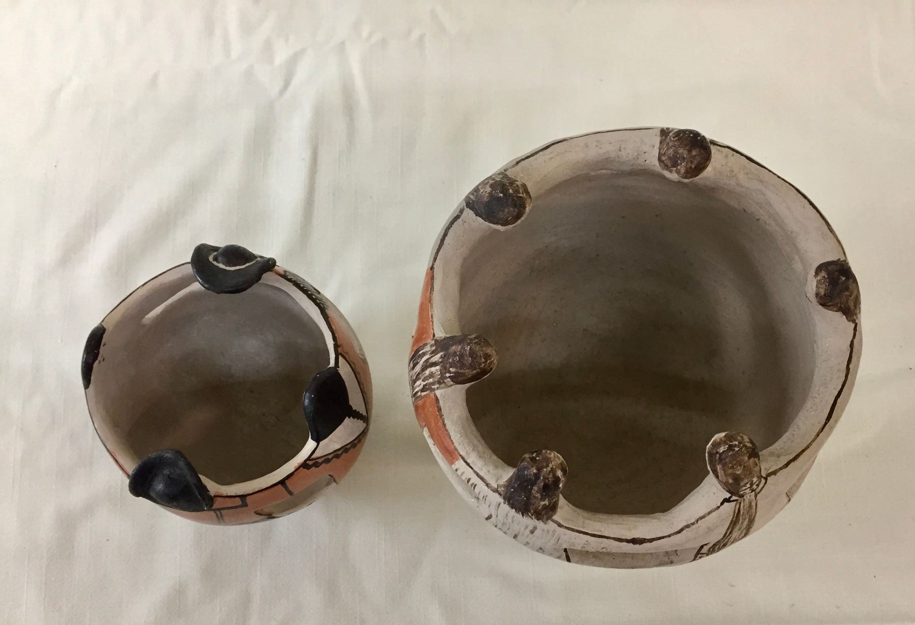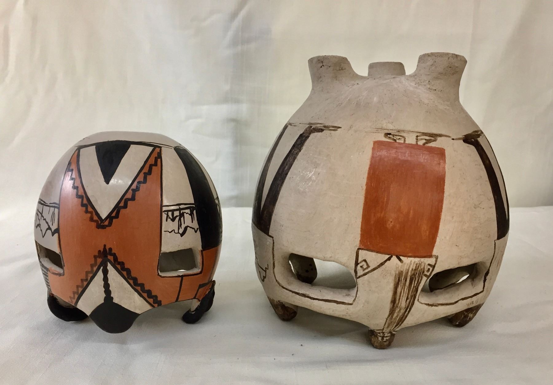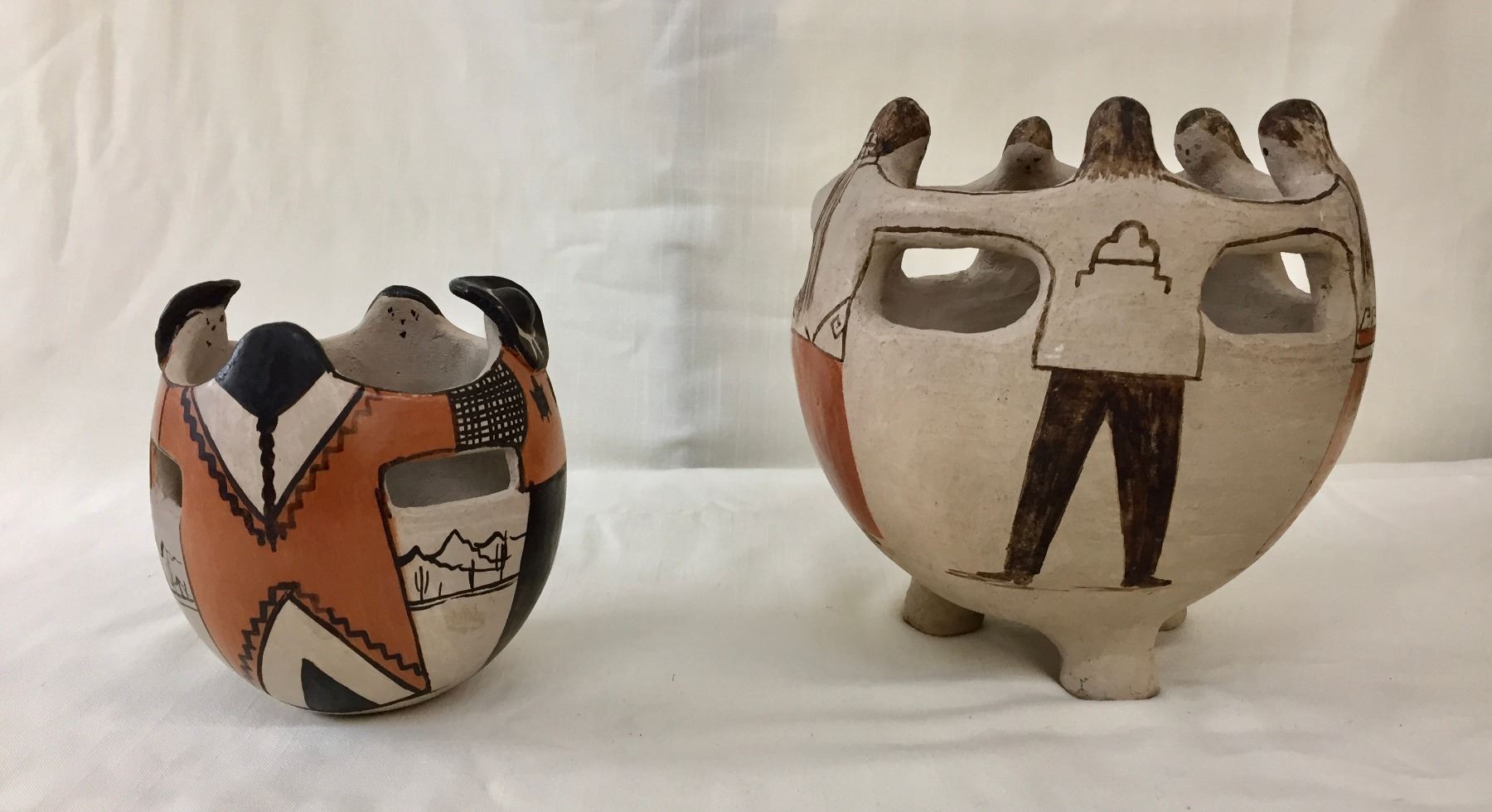 Description: Offered for sale in this lot are two original, Angea family, Tohono O’Odham Friendship pots in excellent vintage condition with minor wear. Signed on bottom. Maker: Rupert Angea (who is now in his 80s) and his sister, Gladys Angea. Approx. Age: Vintage. Size: 7-1/4”w x 7” tall and 5” w x 5-3/8” tall. Condition: Good for their age, normal wear expected. Please look closely at the pictures - they are an important part of our description. Shipping: There will be a $10 handling / packaging fee for shipping this lot. The actual cost of postage will be added on top of that.