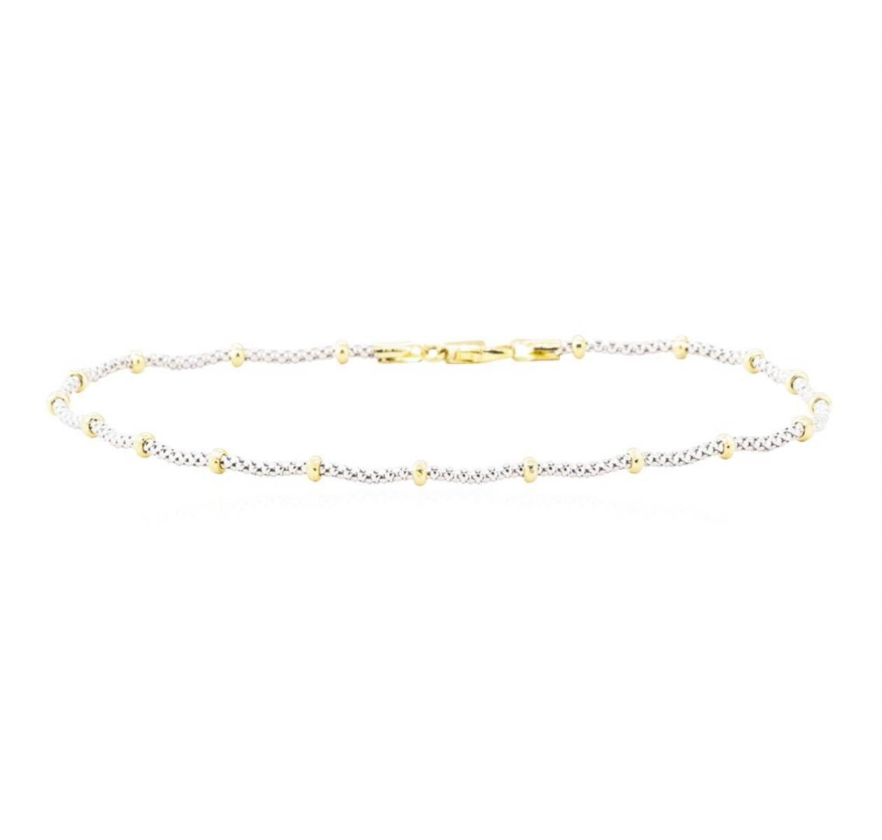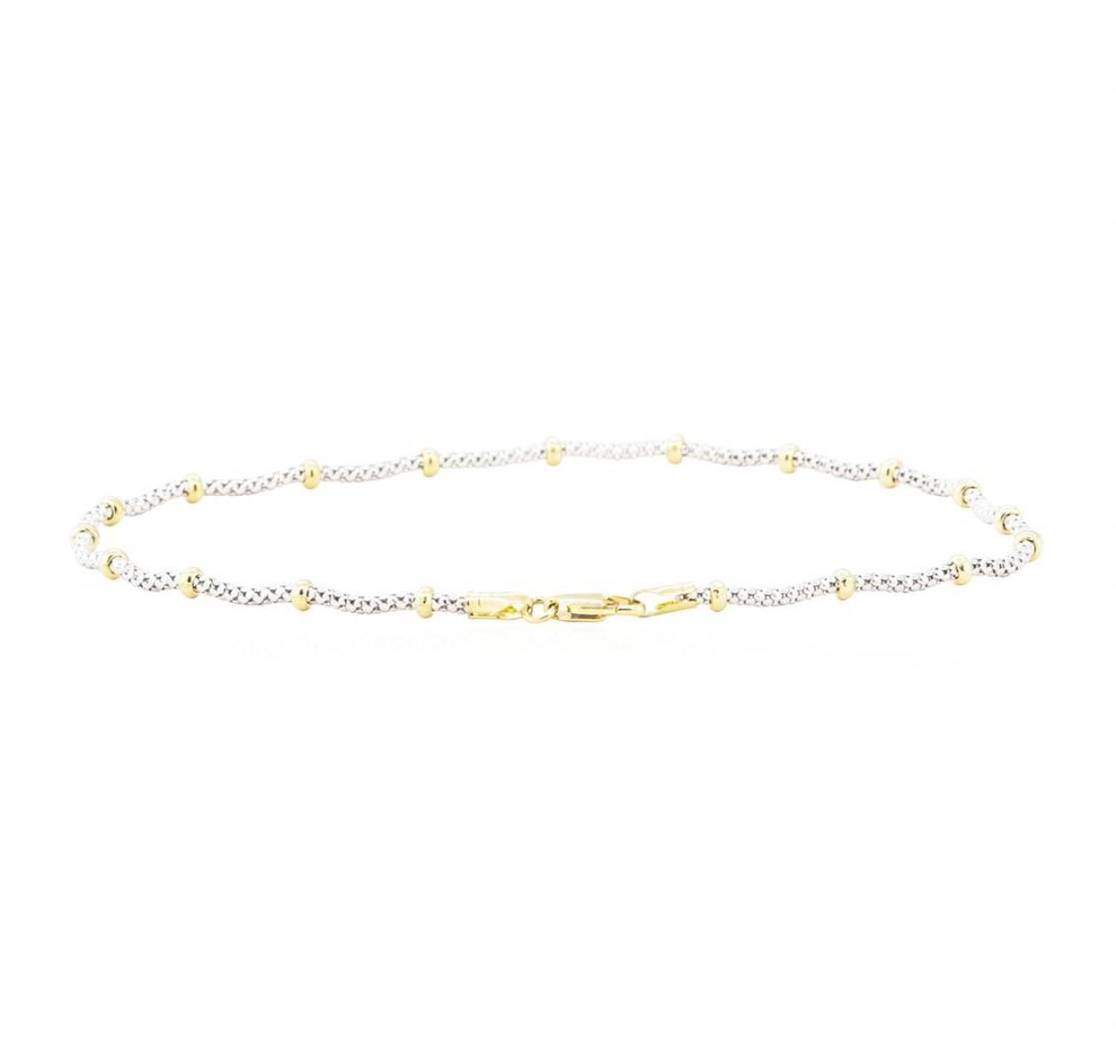 One two-tone ankle bracelet measuring approximately nine inches in length and 2.5mm in width featuring: 14KT white and yellow gold weighing 3.4 grams.