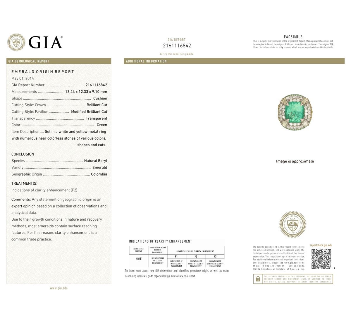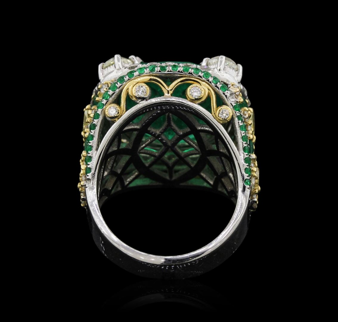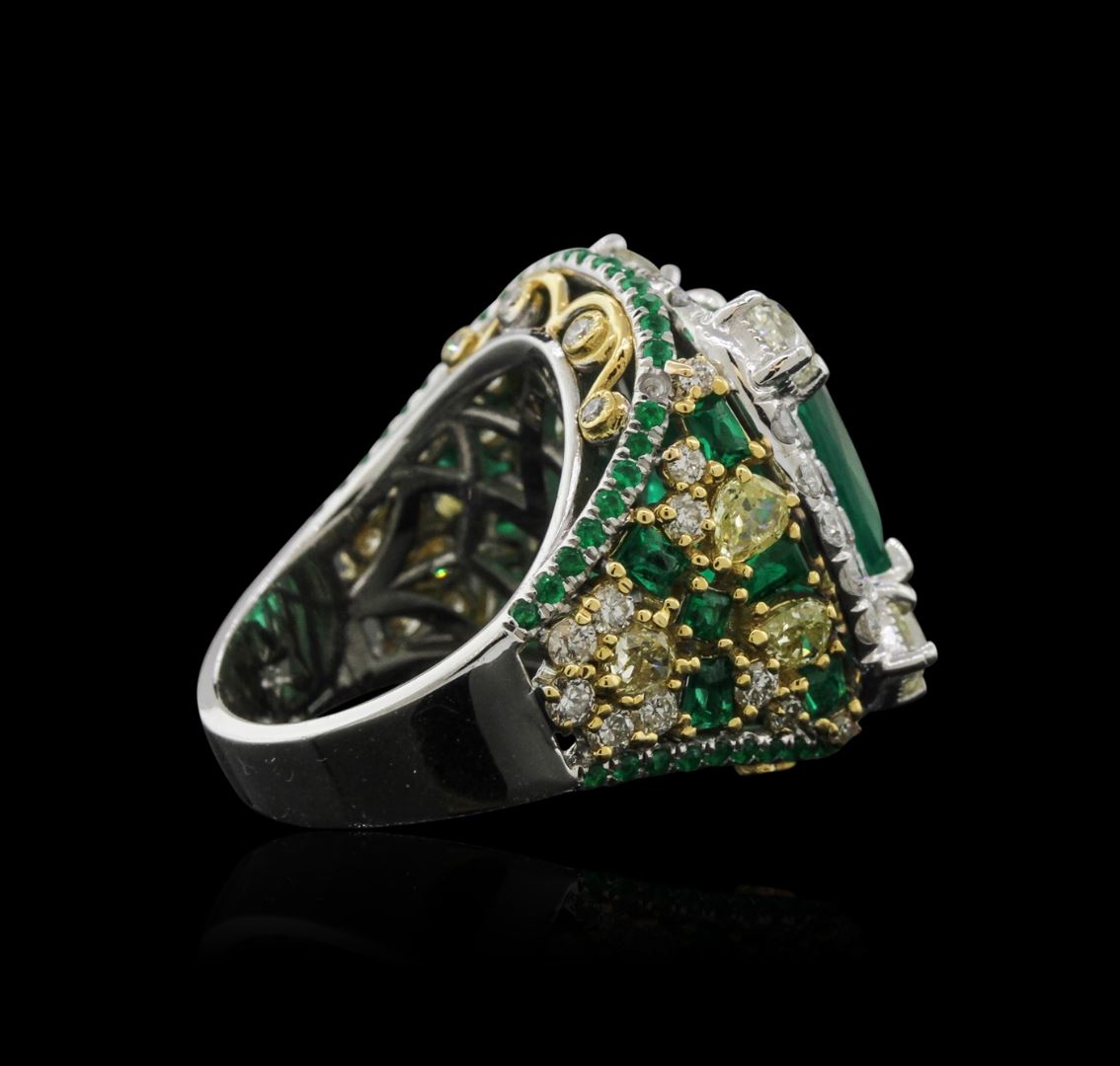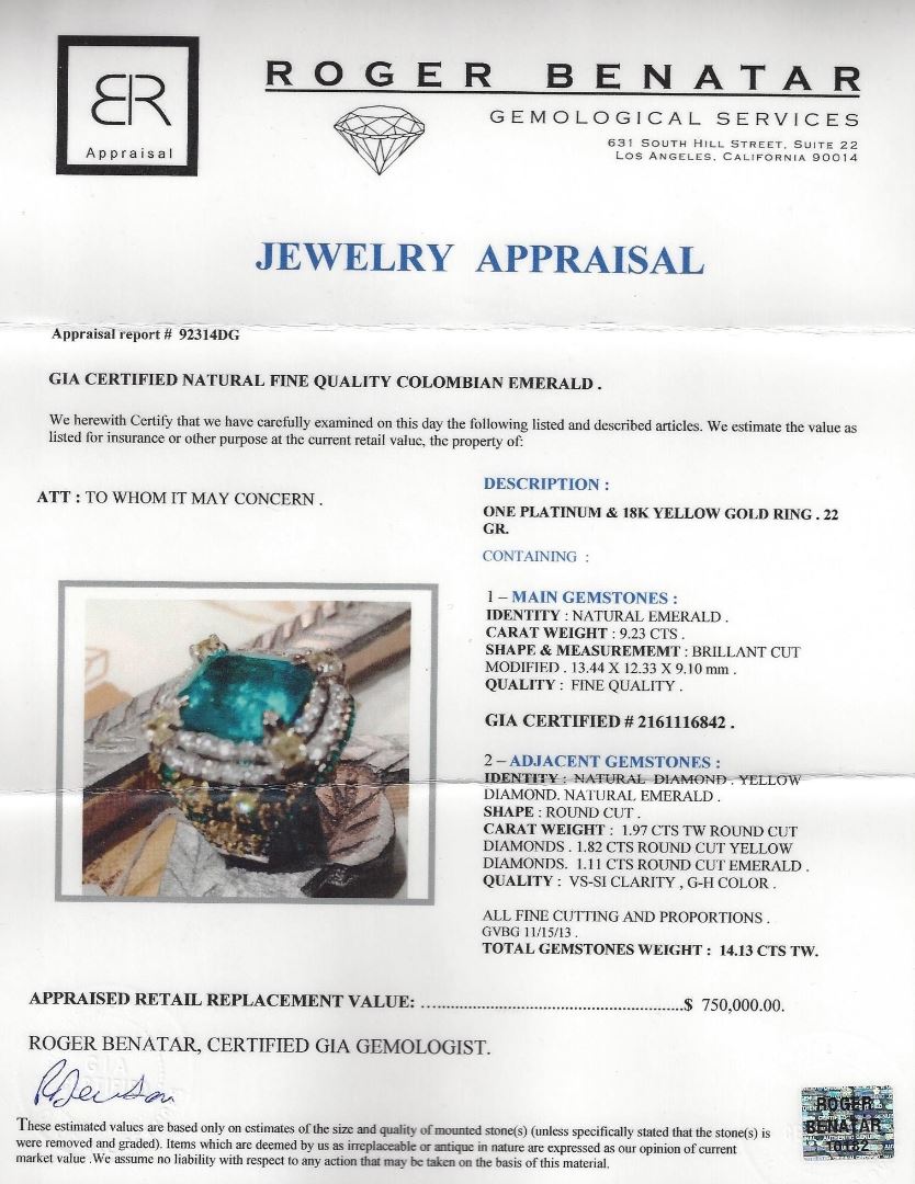 One platinum and 18KT yellow gold ring weighing 22.00 grams containing: One natural emerald center stone with a total weight of 9.23ct. Shape and Measurement: Brilliant cut modified, 13.44 x 12.33 x 9.10mm. Quality: Fine quality. Round cut emerald side stones with a total weight of 1.11ct. Round cut white and yellow diamonds with a total weight of 3.79ct. Quality: VS-SI clarity, G-H color.