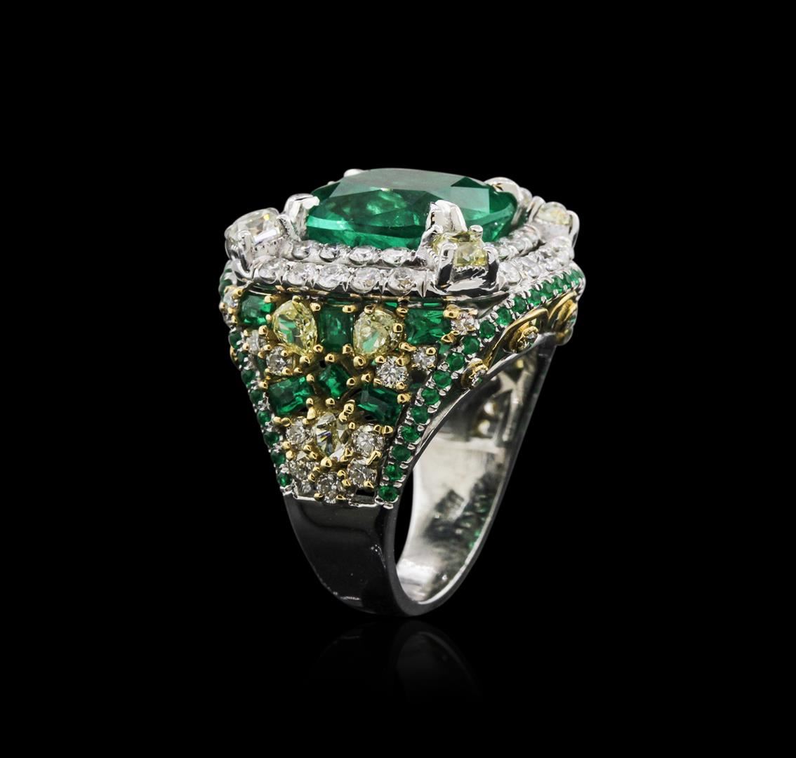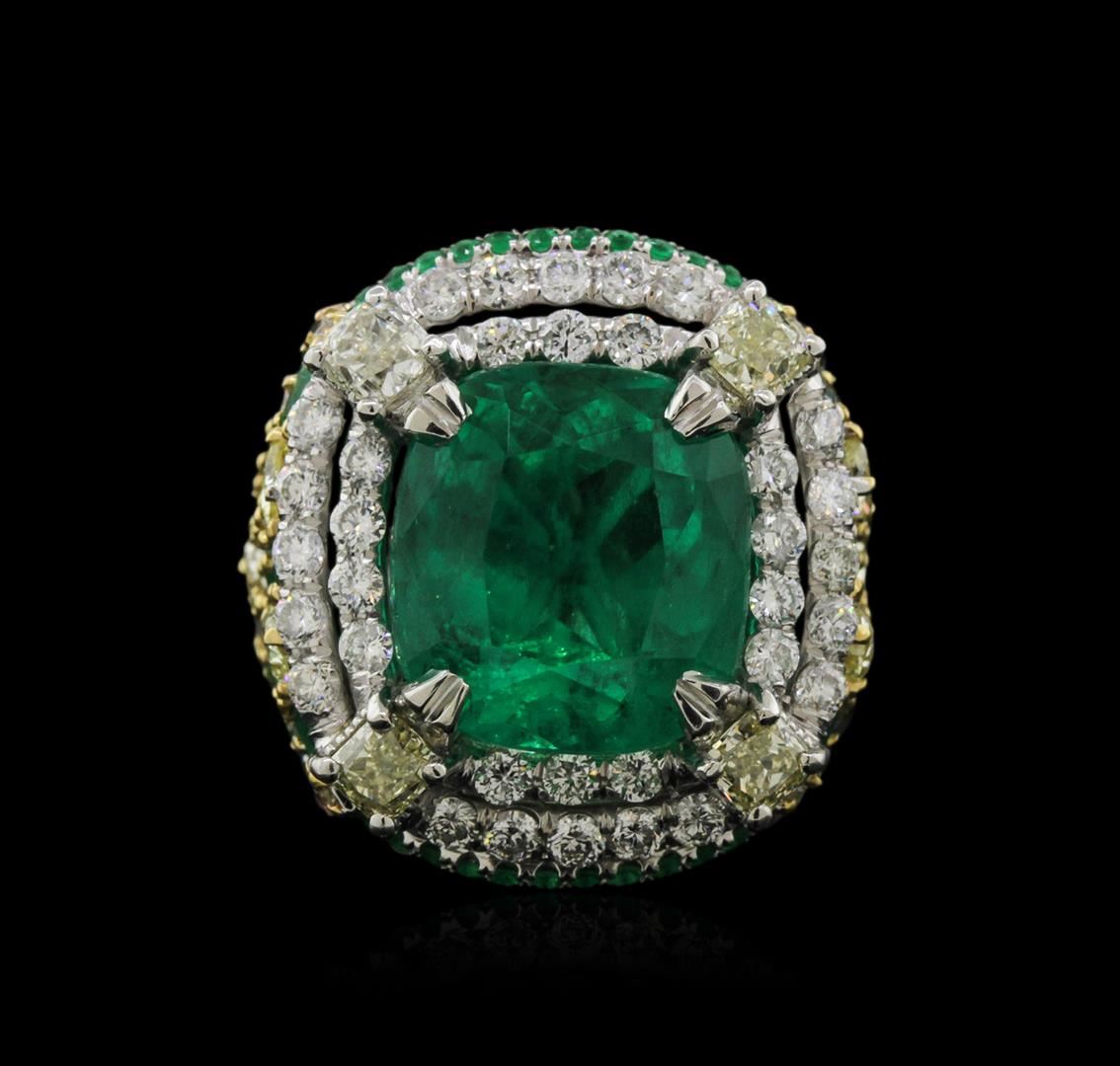 One platinum and 18KT yellow gold ring weighing 22.00 grams containing: One natural emerald center stone with a total weight of 9.23ct. Shape and Measurement: Brilliant cut modified, 13.44 x 12.33 x 9.10mm. Quality: Fine quality. Round cut emerald side stones with a total weight of 1.11ct. Round cut white and yellow diamonds with a total weight of 3.79ct. Quality: VS-SI clarity, G-H color.