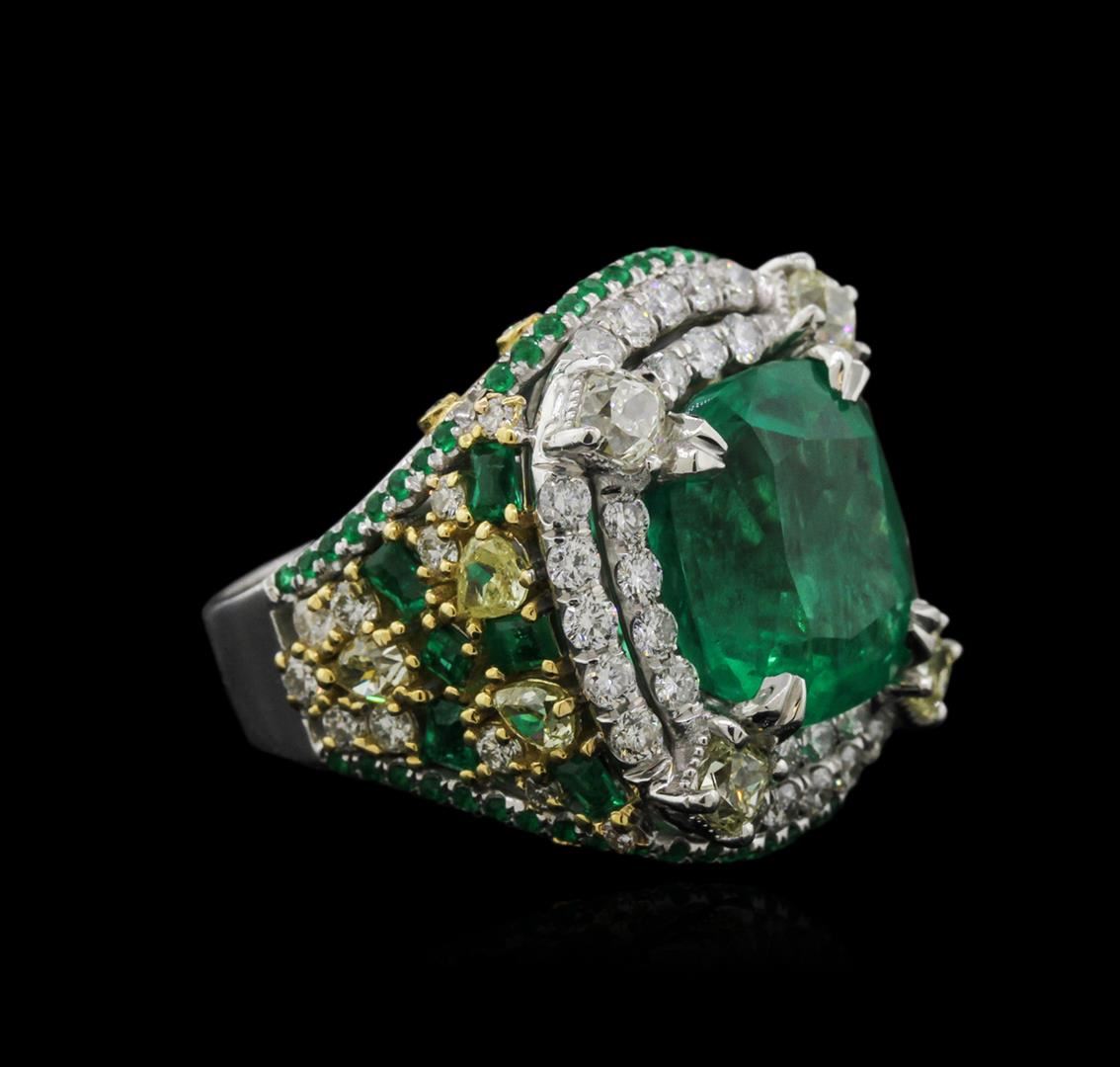 One platinum and 18KT yellow gold ring weighing 22.00 grams containing: One natural emerald center stone with a total weight of 9.23ct. Shape and Measurement: Brilliant cut modified, 13.44 x 12.33 x 9.10mm. Quality: Fine quality. Round cut emerald side stones with a total weight of 1.11ct. Round cut white and yellow diamonds with a total weight of 3.79ct. Quality: VS-SI clarity, G-H color.