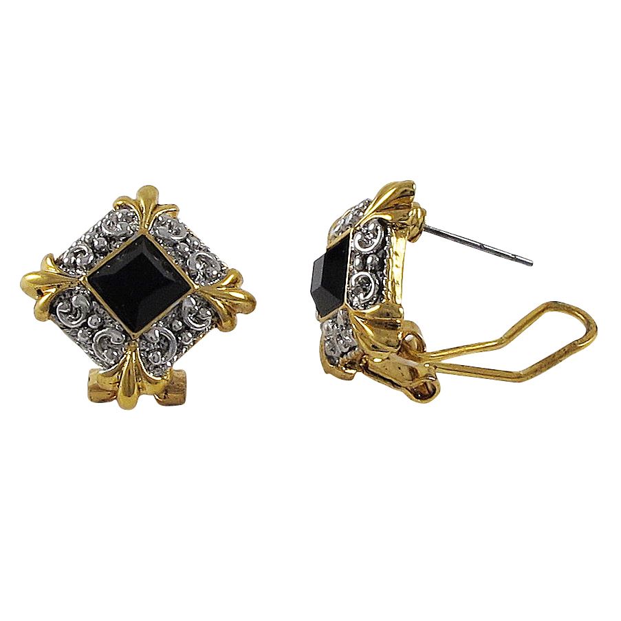 Beautiful Two Tone Omega Clip Earrings, With Black Square Shape Stone In The Center.