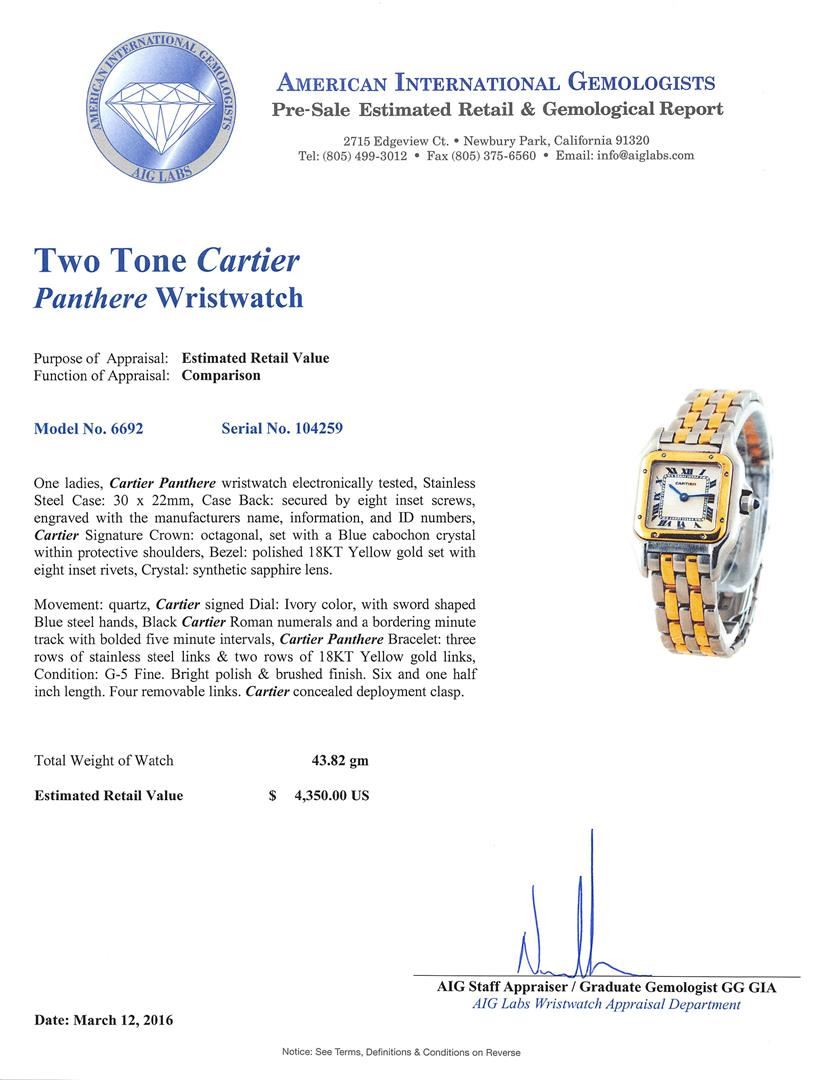 One ladies, Cartier Panthere wristwatch electronically tested, Stainless Steel Case: 30 x 22mm, Case Back: secured by eight inset screws, engraved with the manufacturers name, information, and ID numbers, Cartier Signature Crown: octagonal, set with a Blue cabochon crystal within protective shoulders, Bezel: polished 18KT Yellow gold set with eight inset rivets, Crystal: synthetic sapphire lens. Movement: quartz, Cartier signed Dial: Ivory color, with sword shaped Blue steel hands, Black Cartier Roman numerals and a bordering minute track with bolded five minute intervals, Cartier Panthere Bracelet: three rows of stainless steel links & two rows of 18KT Yellow gold links, Condition: G-5 Fine. Bright polish & brushed finish. Six and one half inch length. Four removable links. Cartier concealed deployment clasp. Total Weight of Watch 43.82gm. AIG Appraised at $4,350.00.