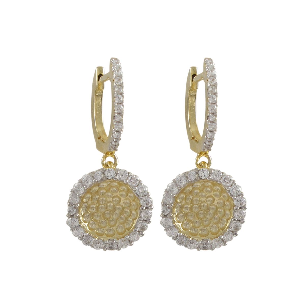 Two Tone Sterling Silver, 13Mm Circle, Matte Gold Plating With White CZ, Hammered Lever Back Earring