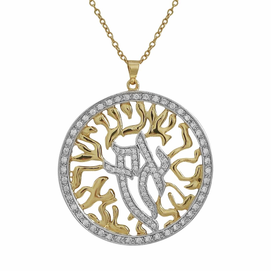Two Tone Sterling Silver CZ Shema Israel Echad Jewish Prayer 40Mm Open Circle Pendant- 1.87"