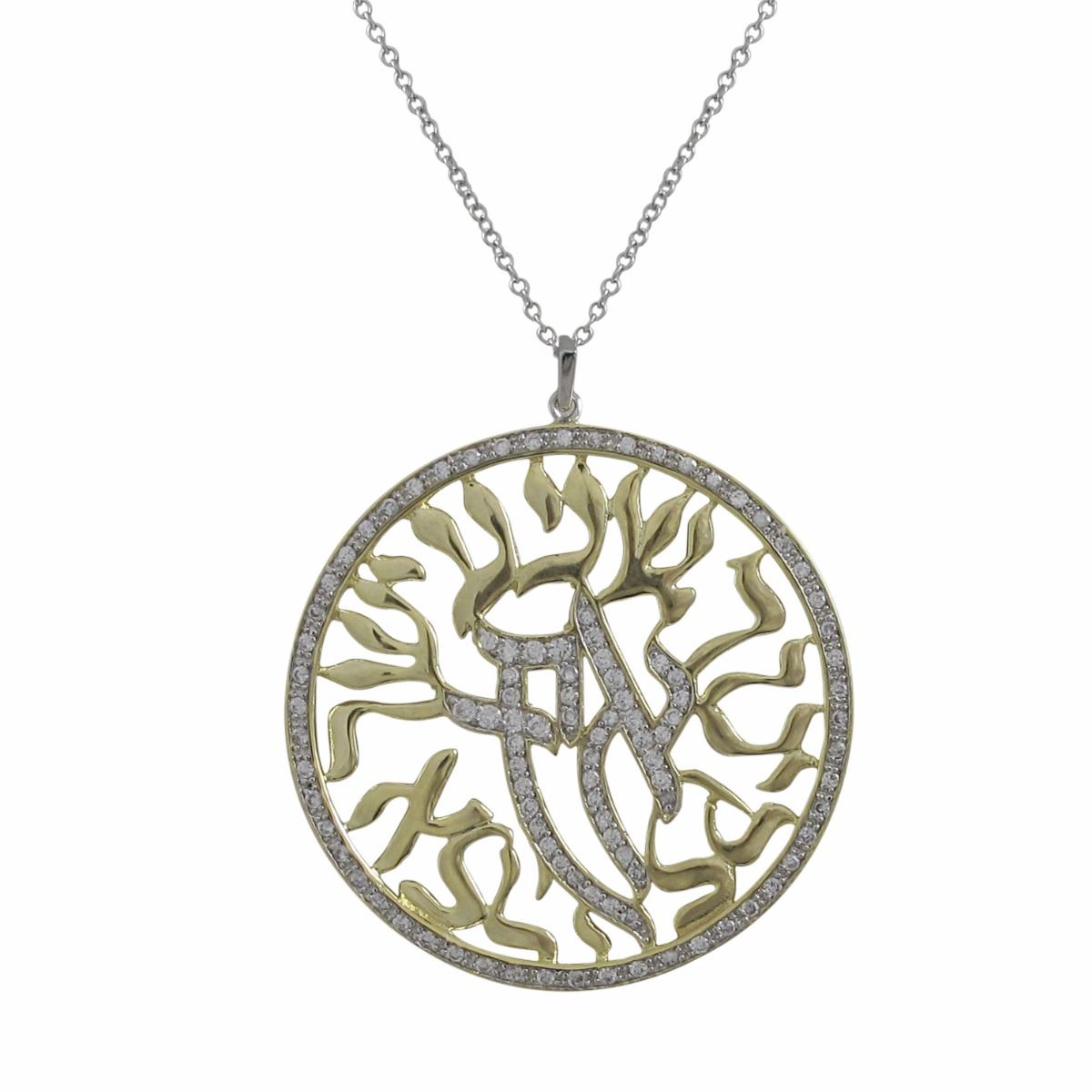 Two Tone Sterling Silver CZ, Shema Israel Echad Jewish Prayer 50Mm Open Circle Pendant, 2.08"