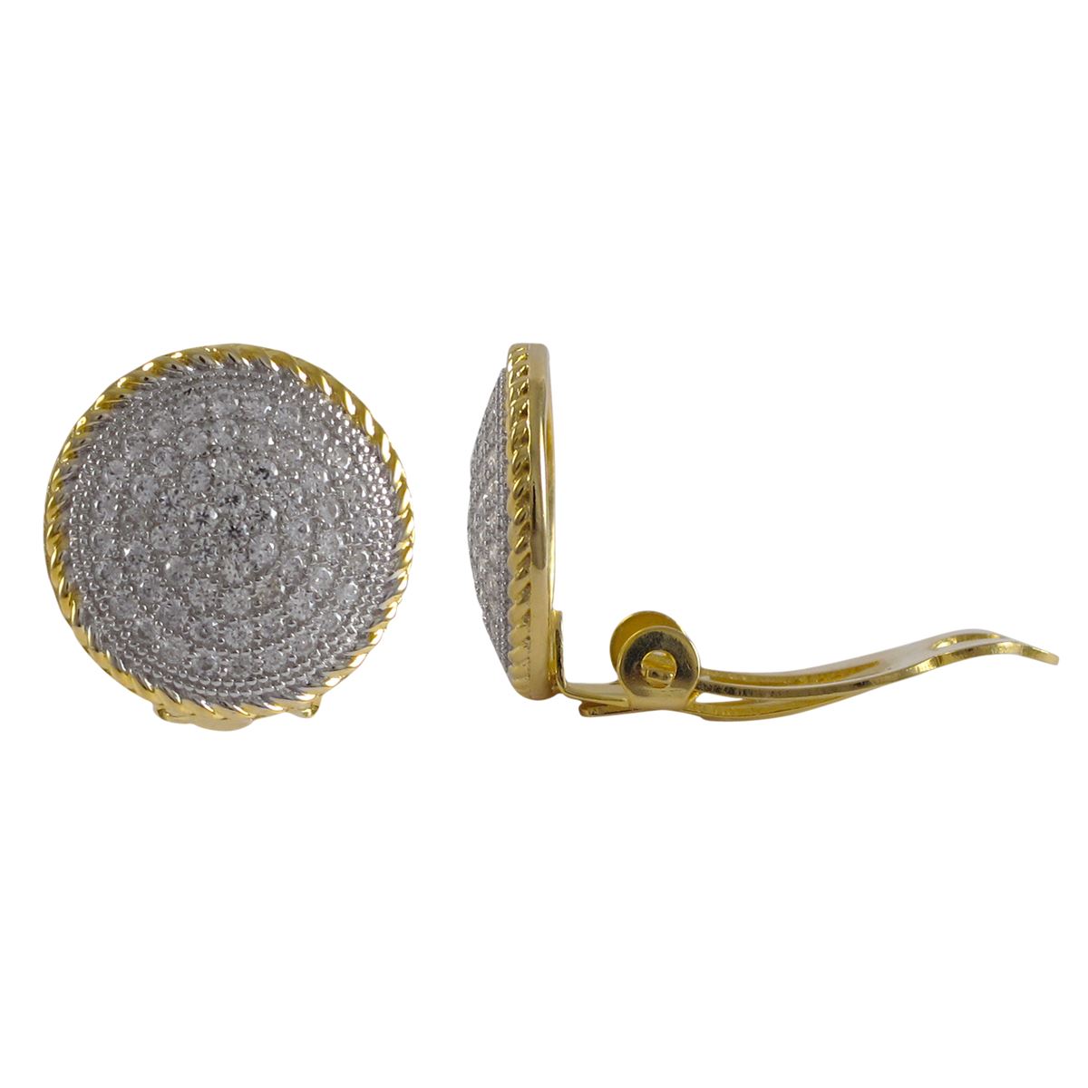 Two Tone Sterling Silver Circle Clip Earrings, White Czs Pave, 17Mm Wide