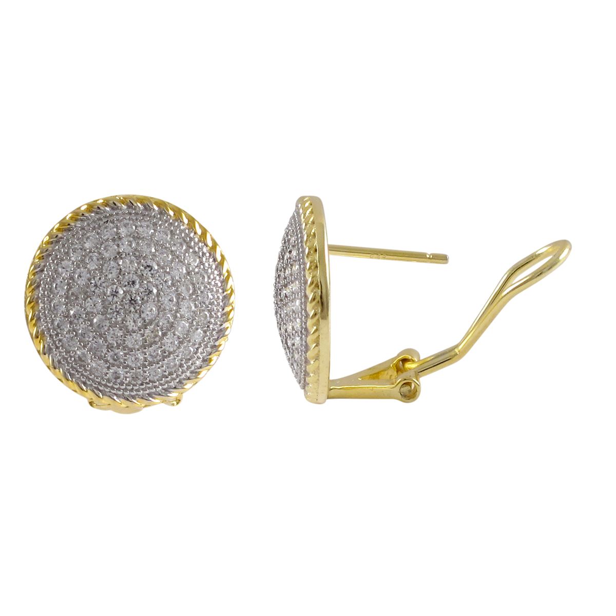 Two Tone Sterling Silver Circle Post Clip Earrings, White Czs Pave, 17Mm Wide