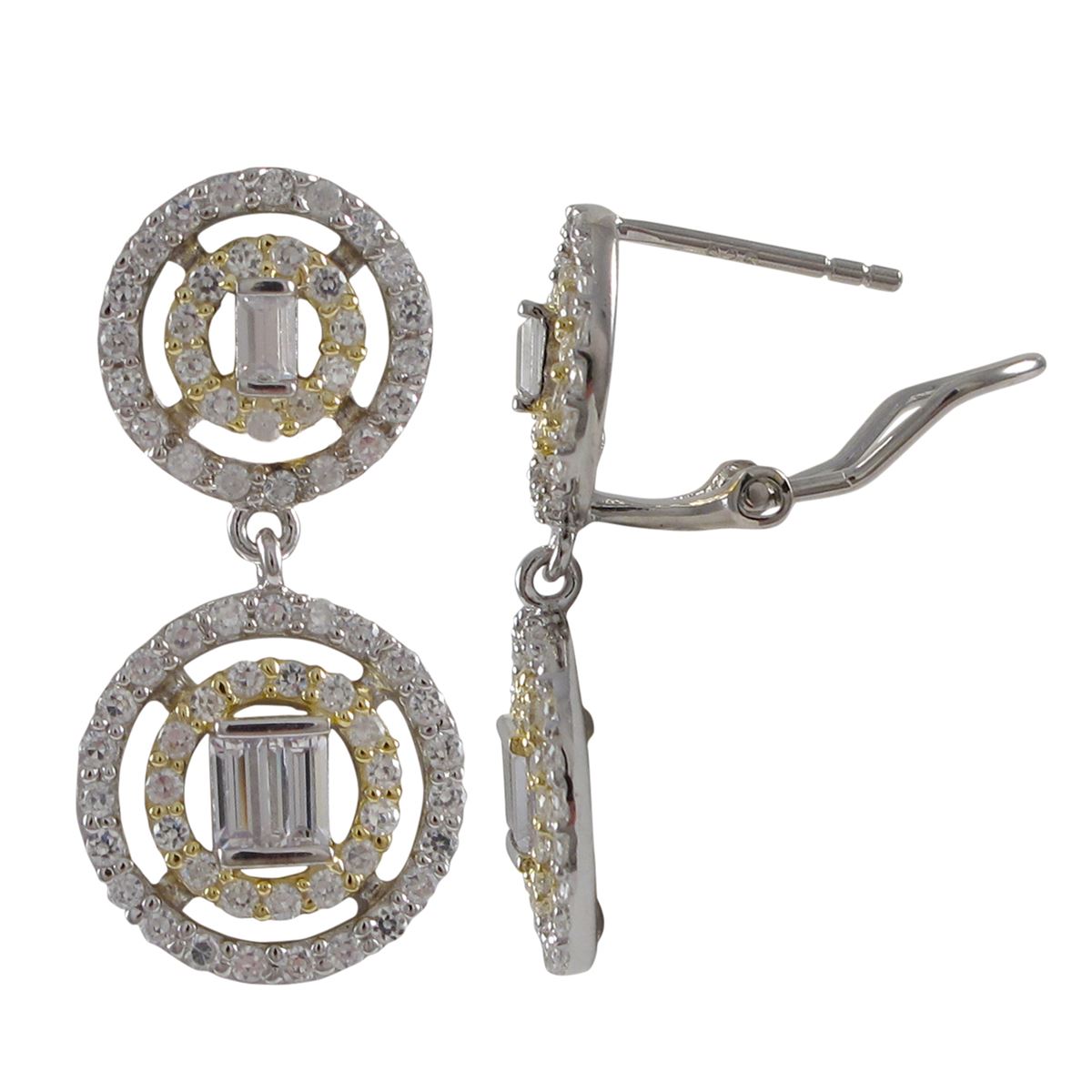 Two Tone Sterling Silver Double Circle Post Clip Earrings, White Czs