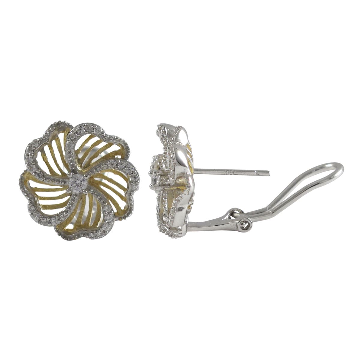 Two Tone Sterling Silver, White CZ 15Mm Flower Post Clip Stud Earrings