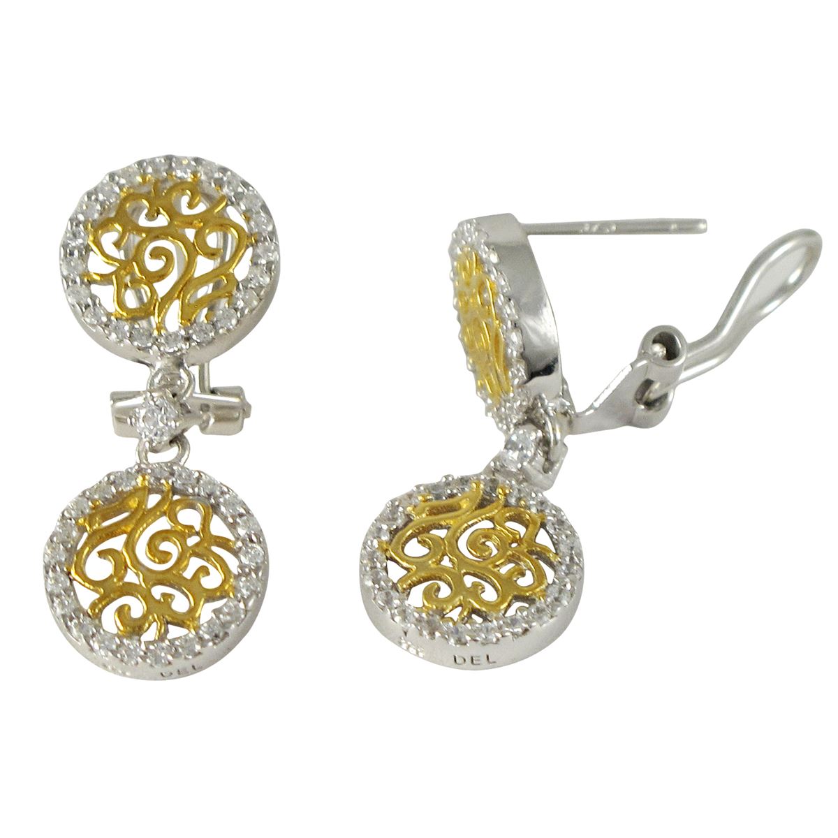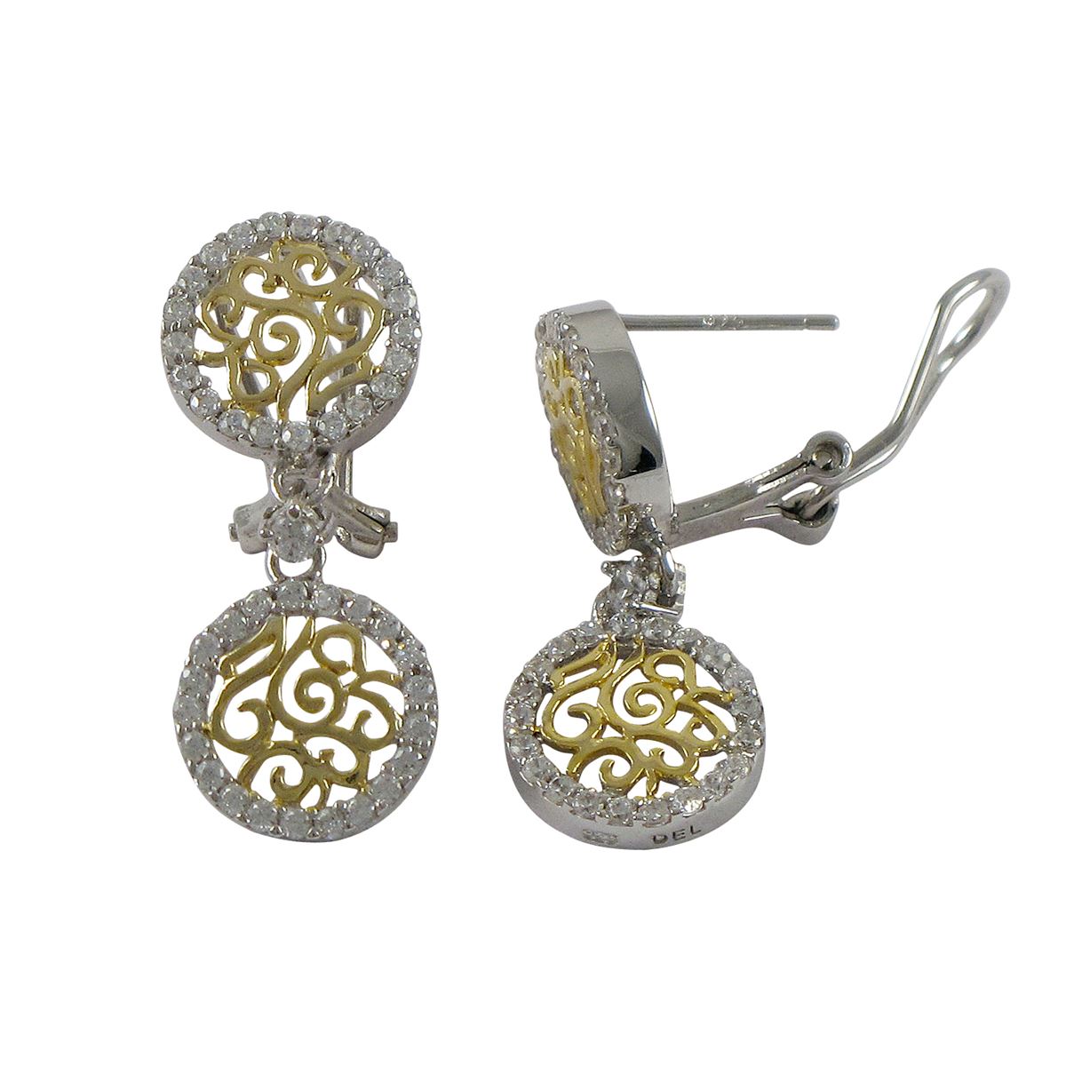 Two Tone Sterling Silver White CZ, Double Filigree 12Mm Circle Post Clip Earrings, 1.18"