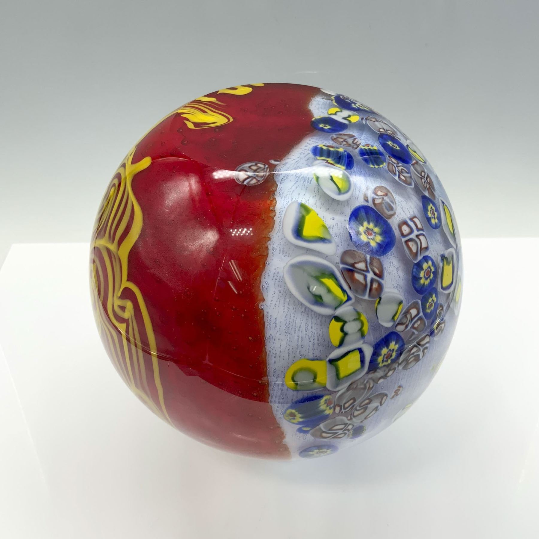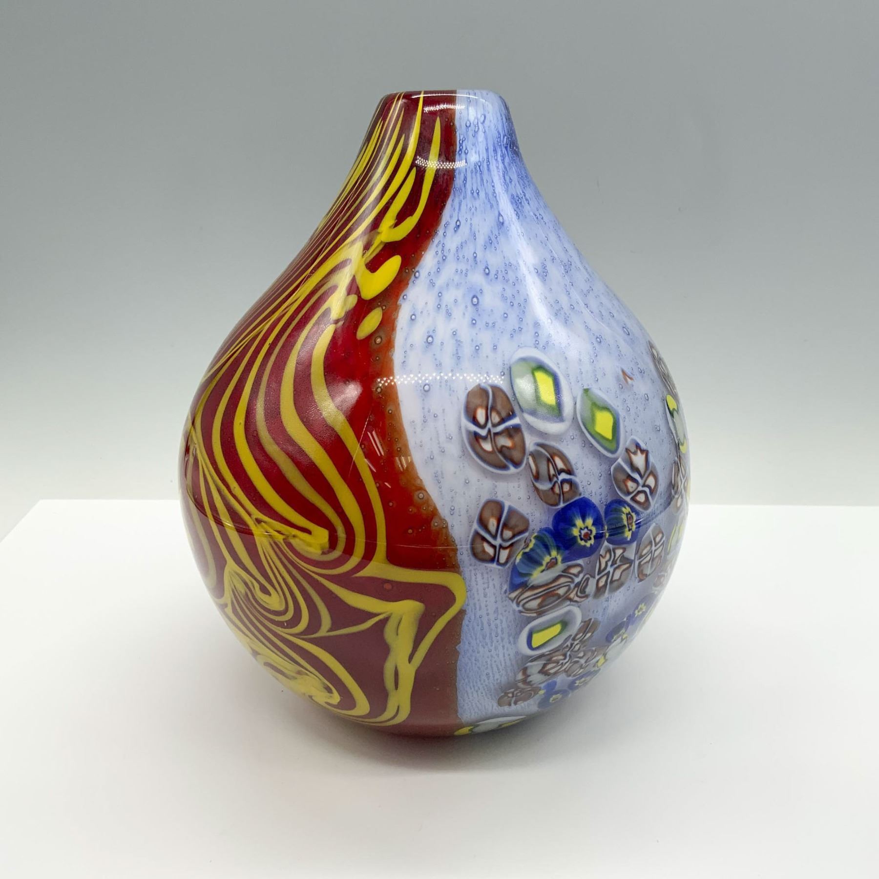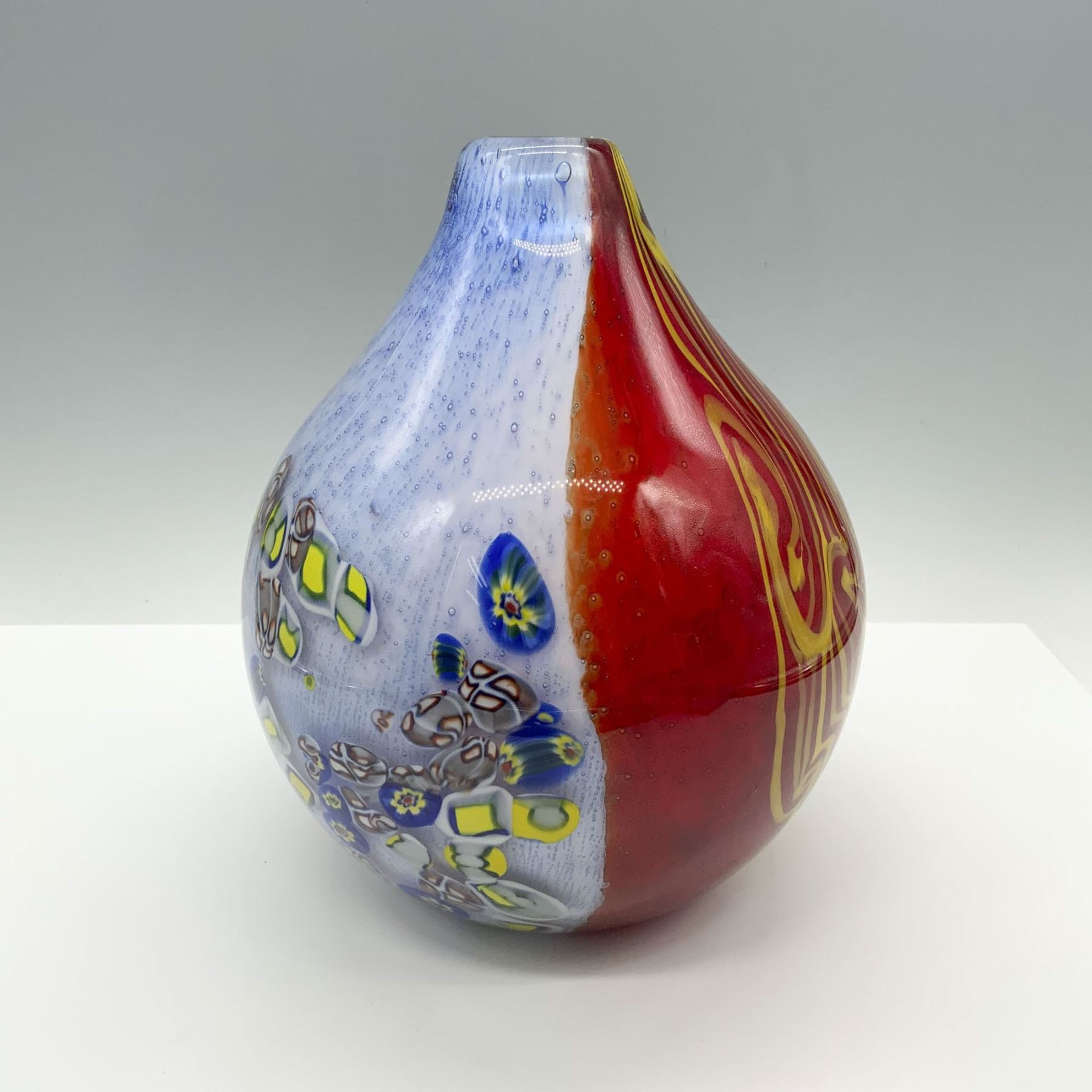 This stunning piece features a half blue and half red design where the red side displays yellow swirls, and the blue side displays multicolored circular patterns. The contrasting colors enhances its vividness.