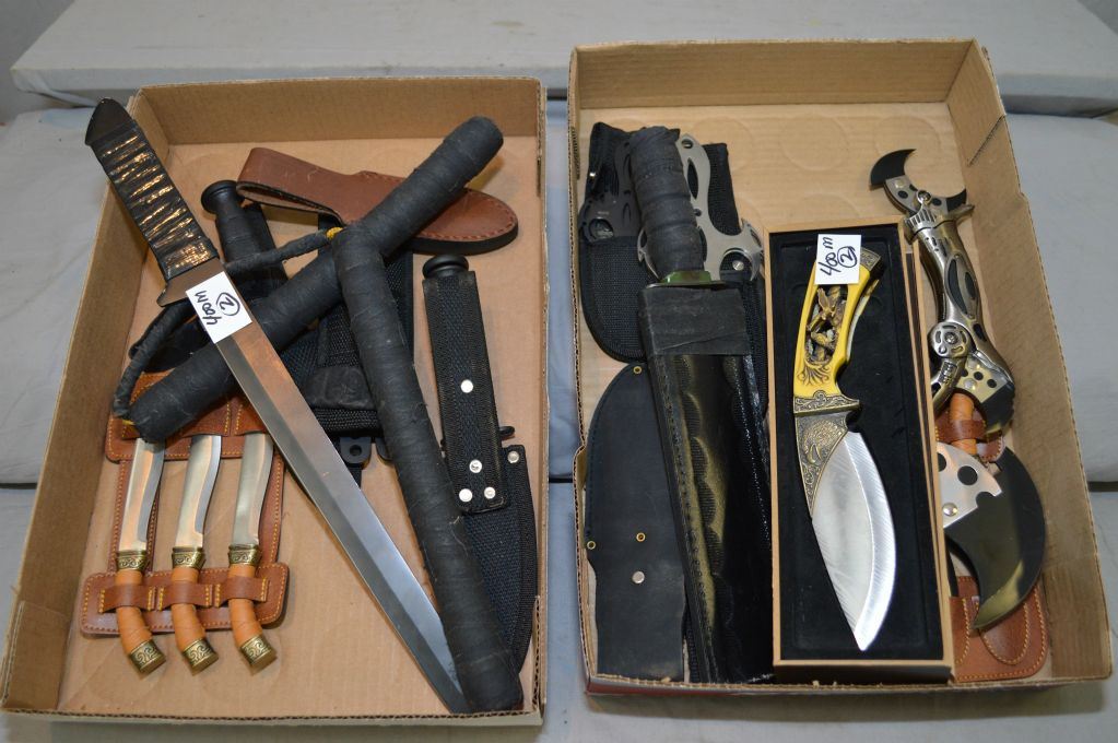 Two Tray Lots : Reproduction Knives, Short Swords, etc. NOTE: NUNCHUCKS HAVE BEEN REMOVED