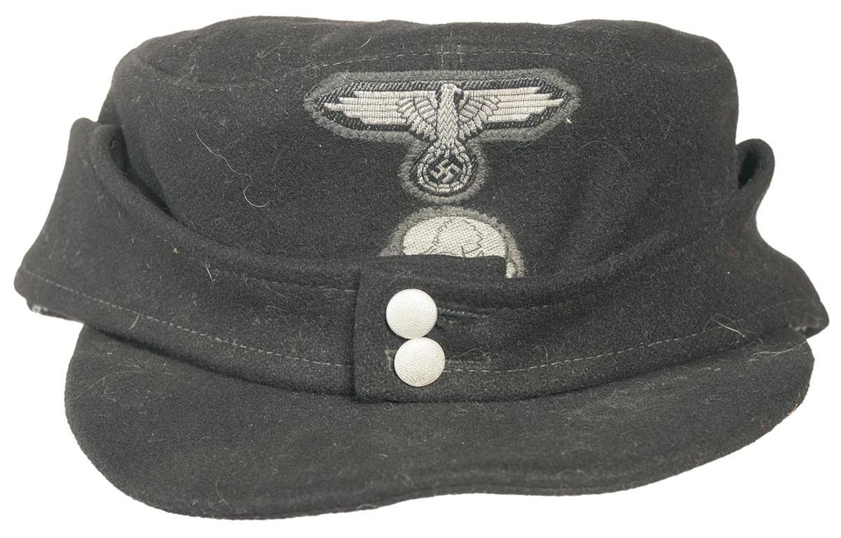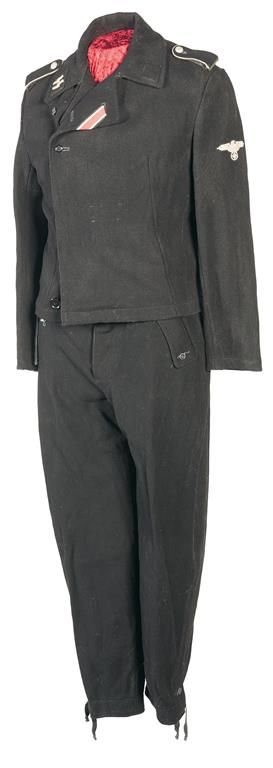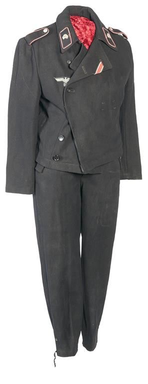 Two Tunics for Nazi Panzer Enlisted Men Including an Waffen-SS Style Schuetz's Panzer Uniform Two Pair of Panzer-Style Trousers and a SS Field Cap