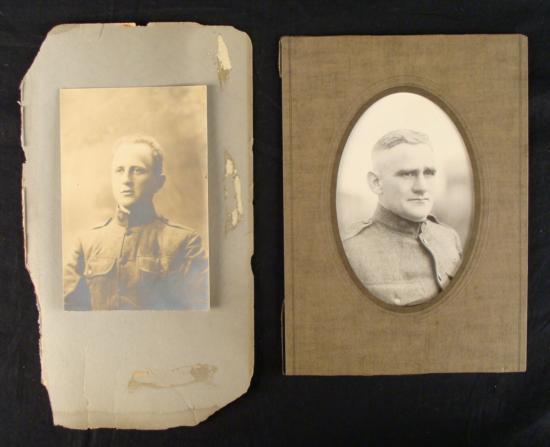 Here are two very nice, early 20th century photos. Both men are from the U.S. Military, posing in each photo. The smaller photo measures out to be 4x6" and the larger one is 5X7". Both photos are in very good condition. The smaller photo is on a riped piece of cardboard and the other one is in a flip-up folder (torn on the back). The photos were taken in various Chicago studios. An perfect addition to any antique or military collection.