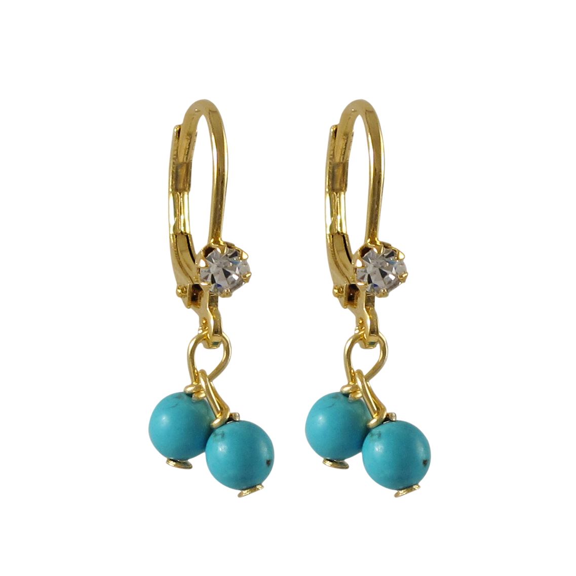 Two Turquoise 4Mm Balls On Gold Tone Brass Lever Back With Crytal Earrings