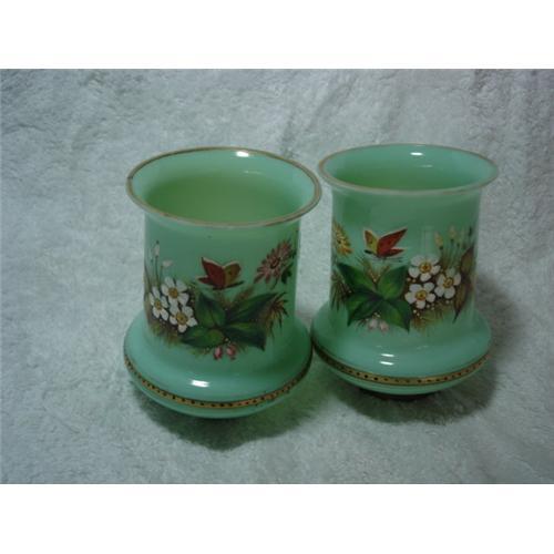 Beautiful antique Floral hand painted Turquoise glasses for a wall sconce. Condition is good but outside rim of one of the glasses has a small nick that is not noticable but can be felt with your finger. The base has a gold tone ring that is 1.5+ inches or 4mm, the depth is .25 inches.