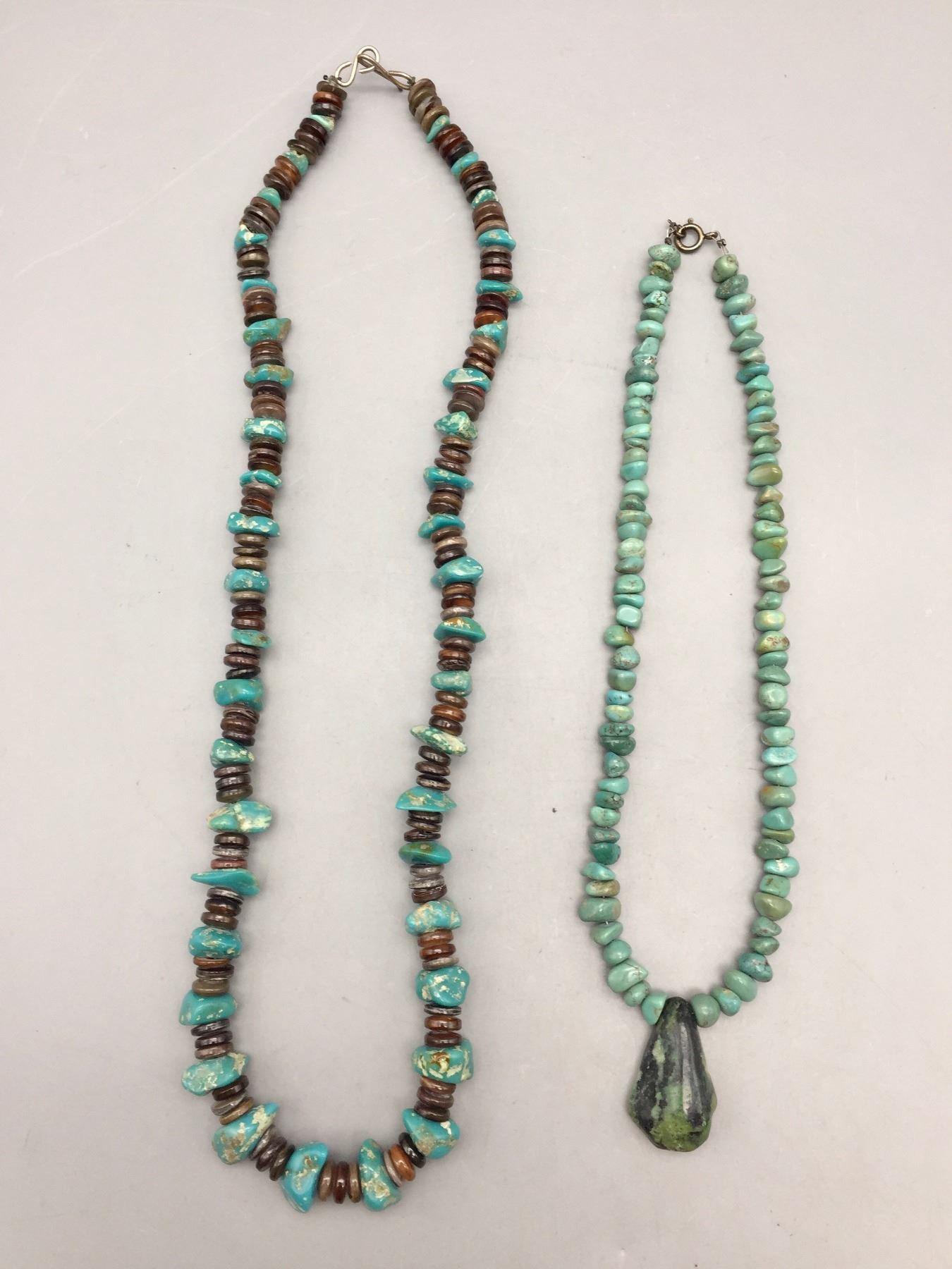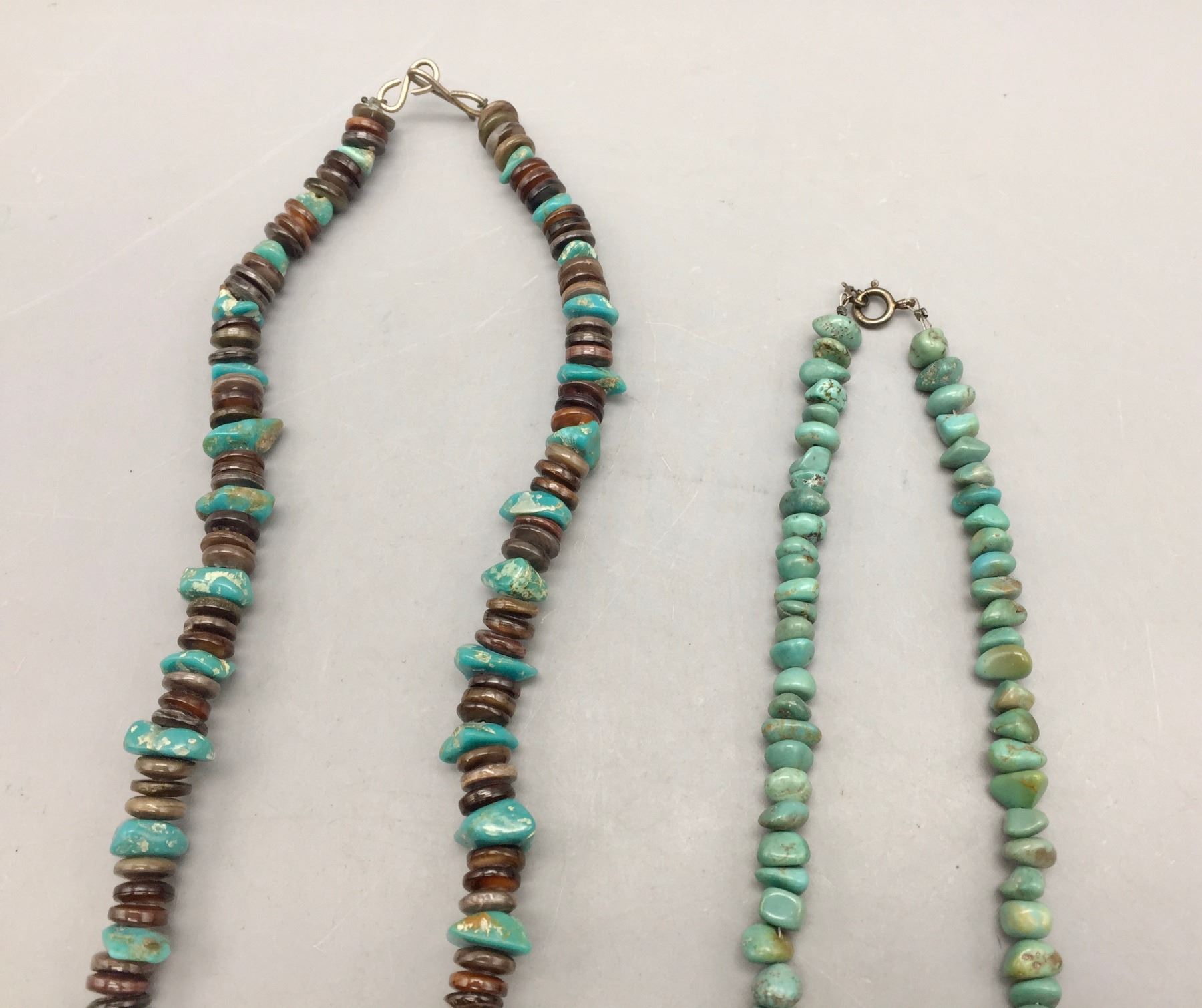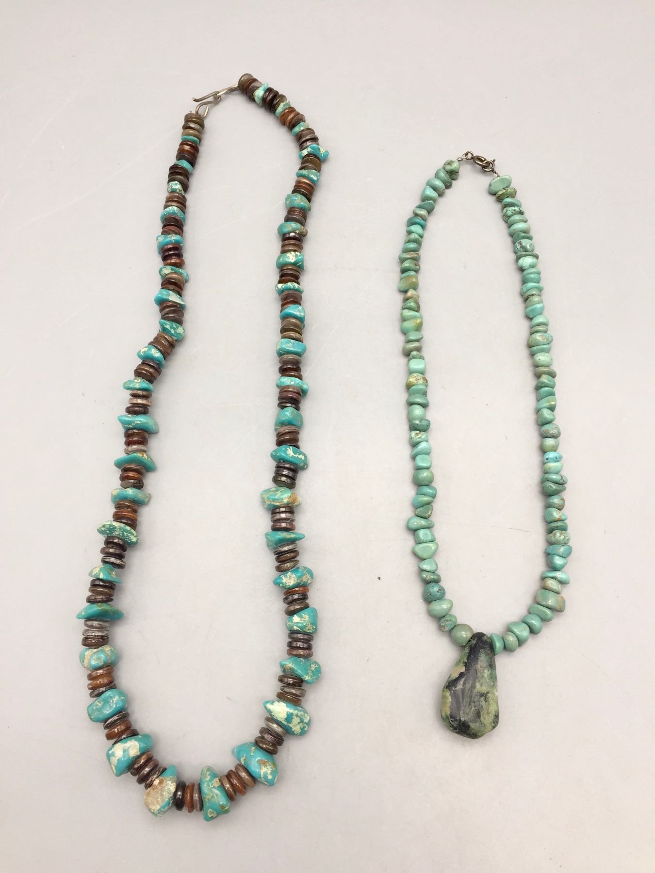 Description: Presented for sale in this lot are two turquoise necklaces, which have some other stones mixed in with sterling silver findings.