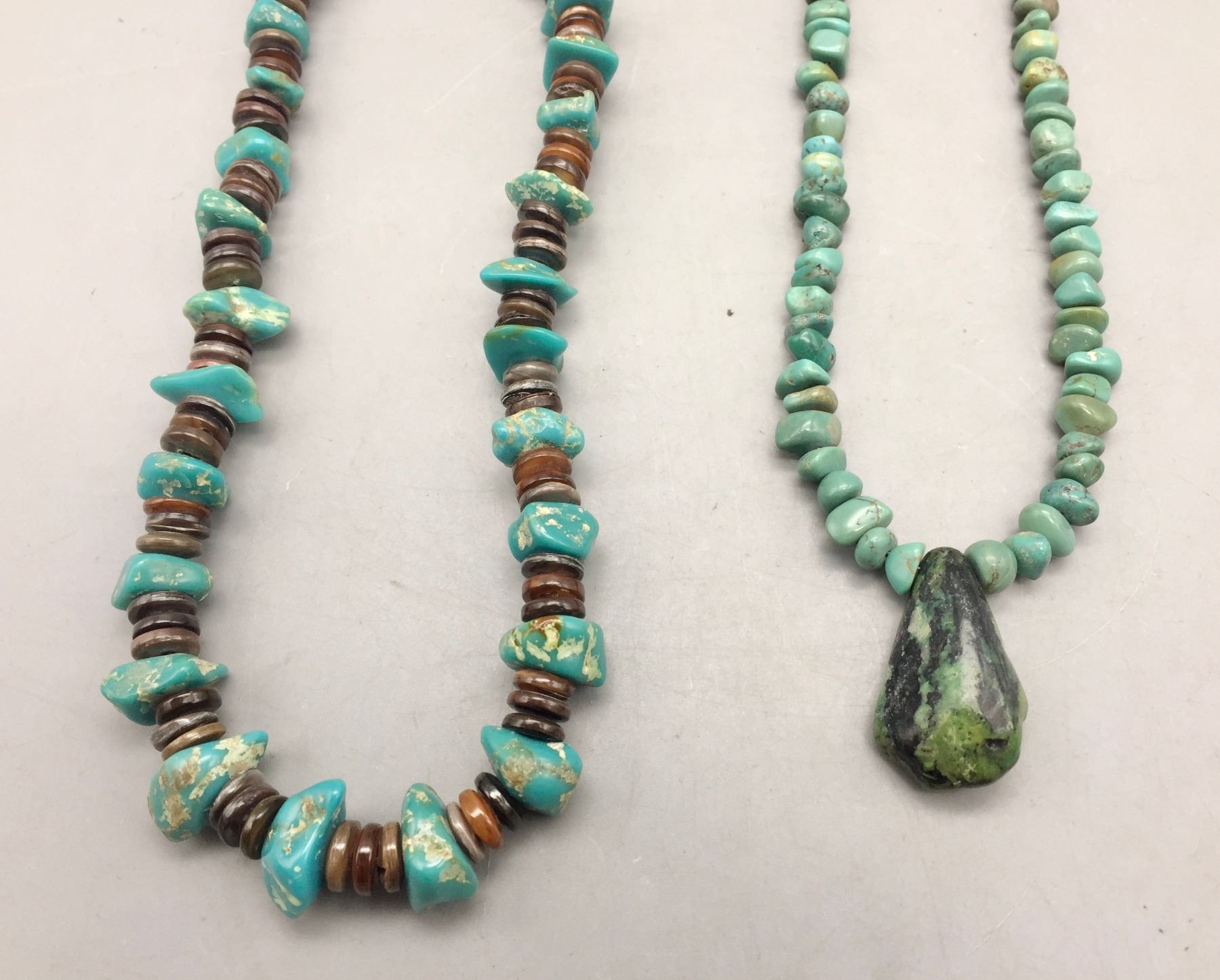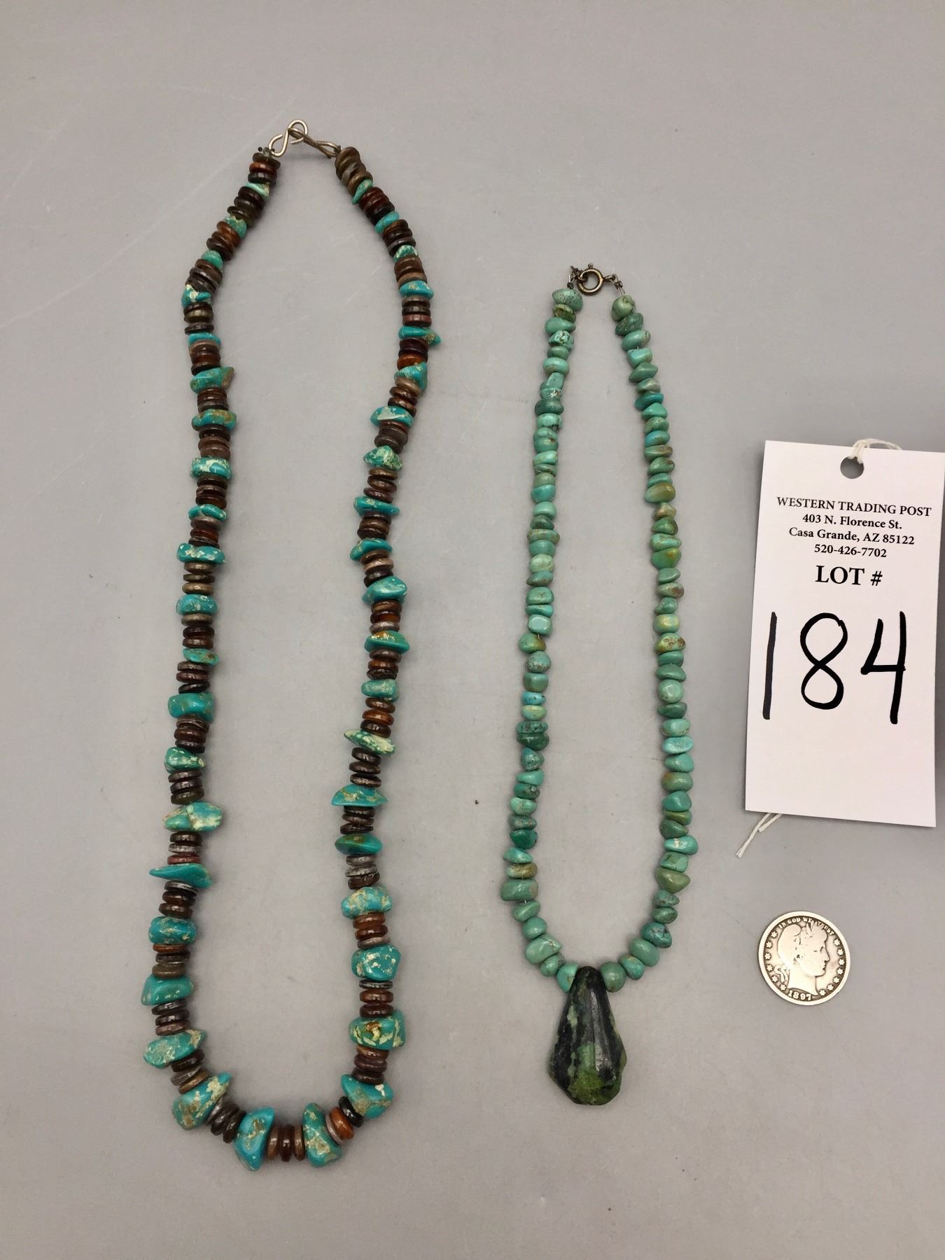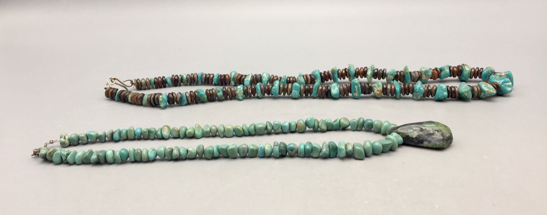 Description: Presented for sale in this lot are two turquoise necklaces, which have some other stones mixed in with sterling silver findings.