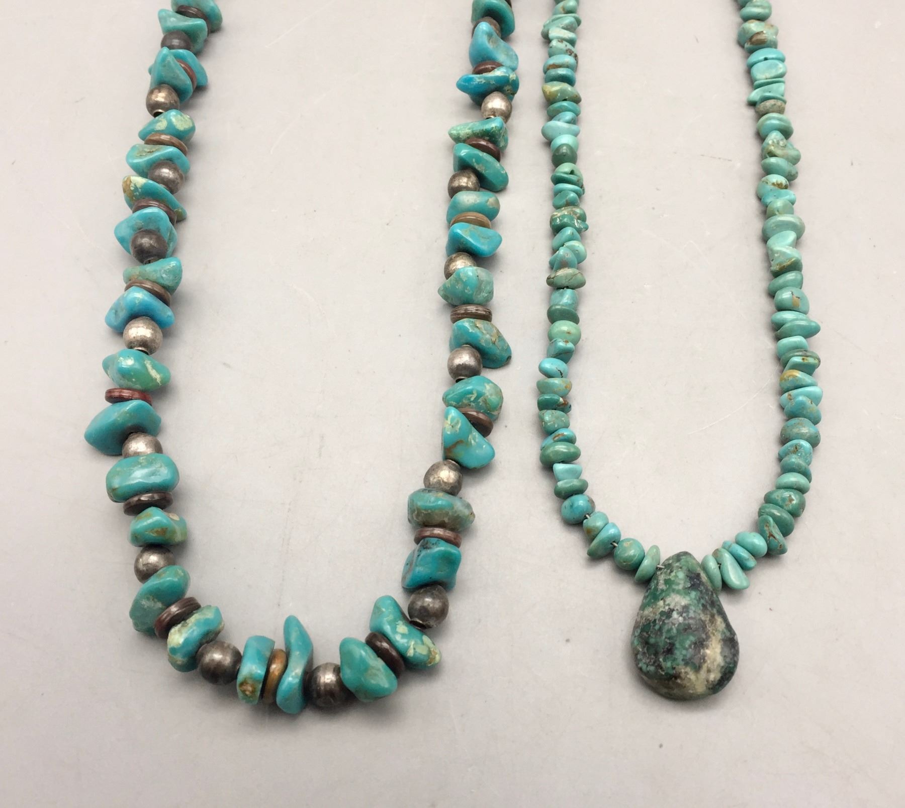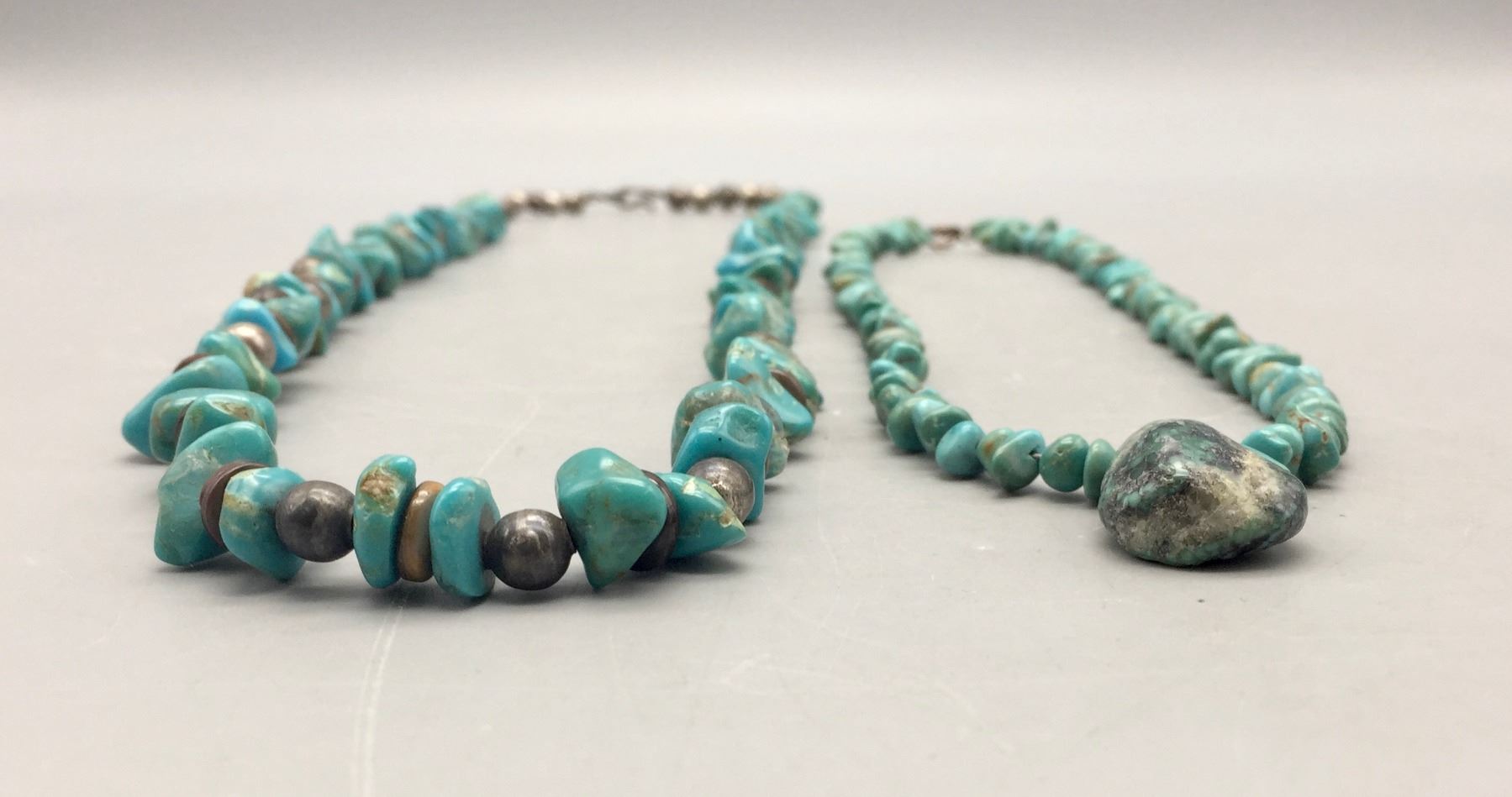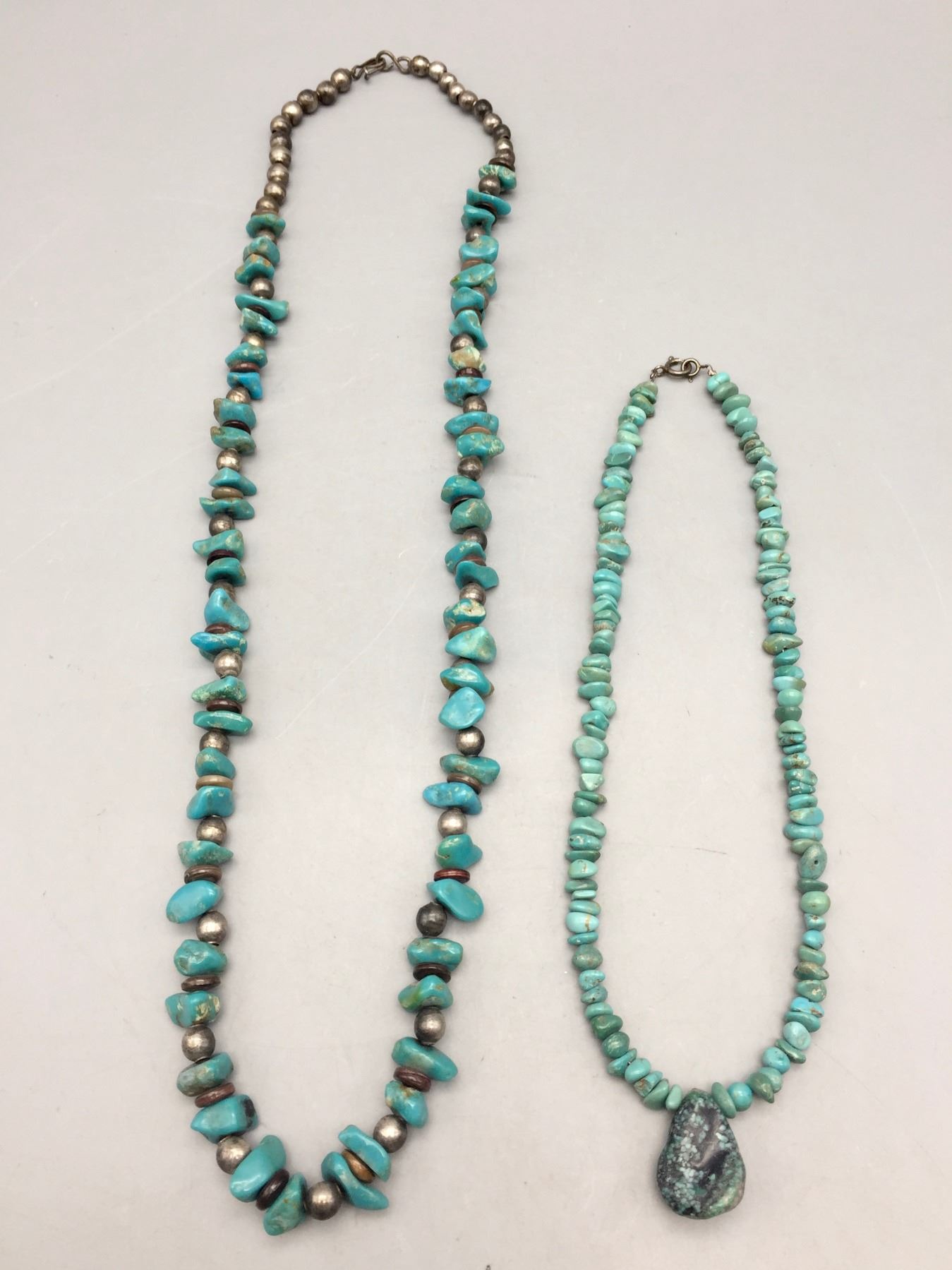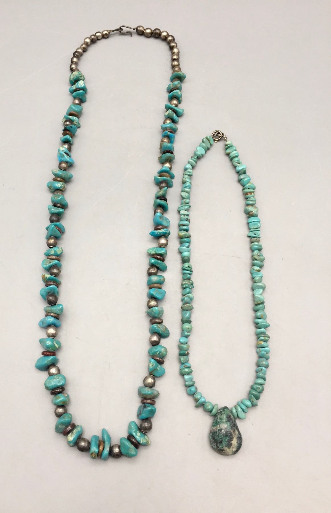 Description: For sale in this lot are two turquoise necklaces, one includes a pendant both have sterling silver findings. Maker: Unknown.