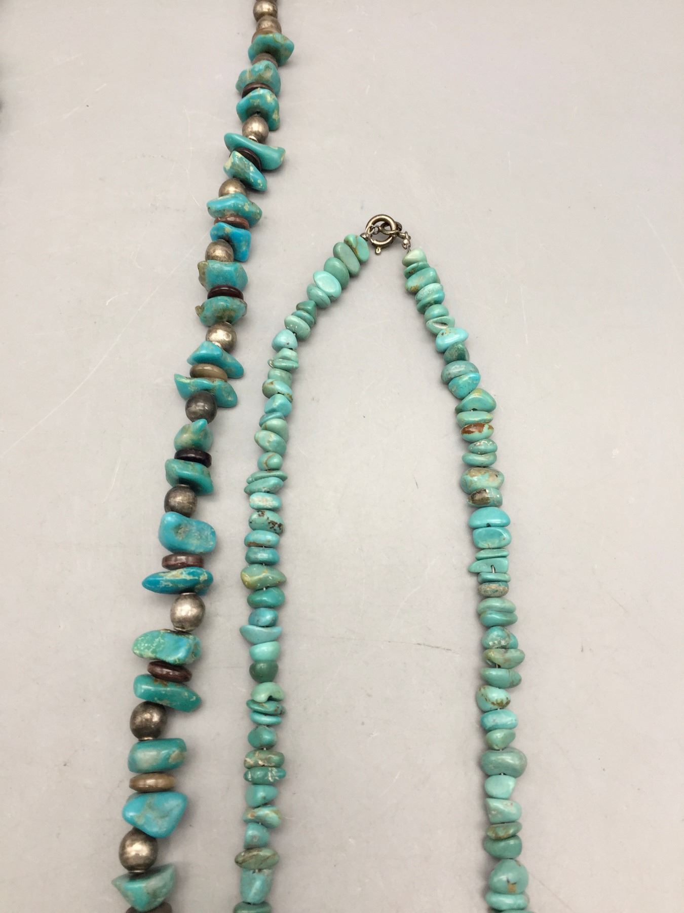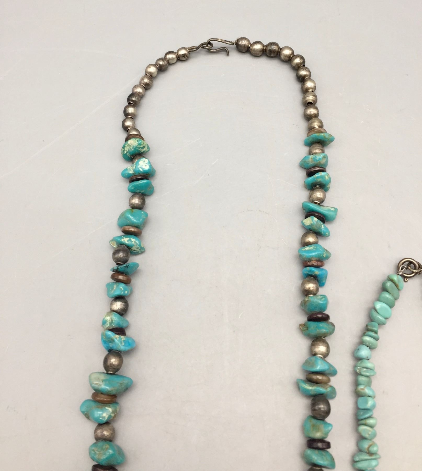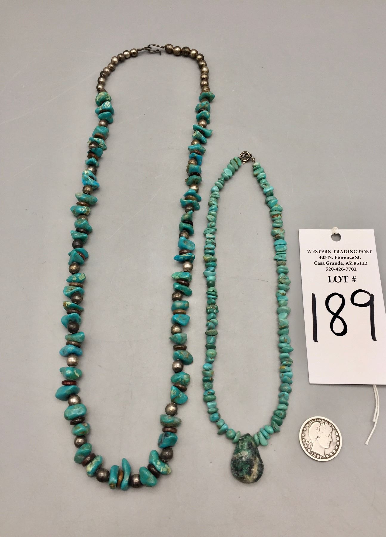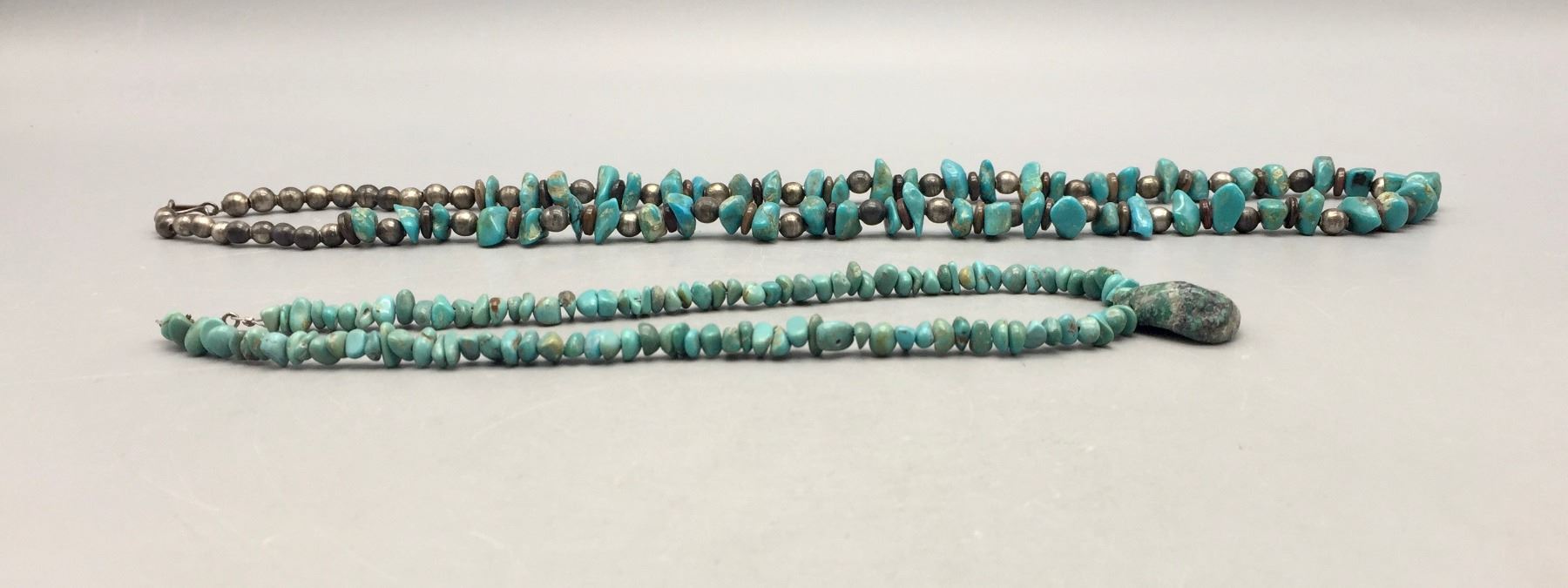 Description: For sale in this lot are two turquoise necklaces, one includes a pendant both have sterling silver findings. Maker: Unknown.