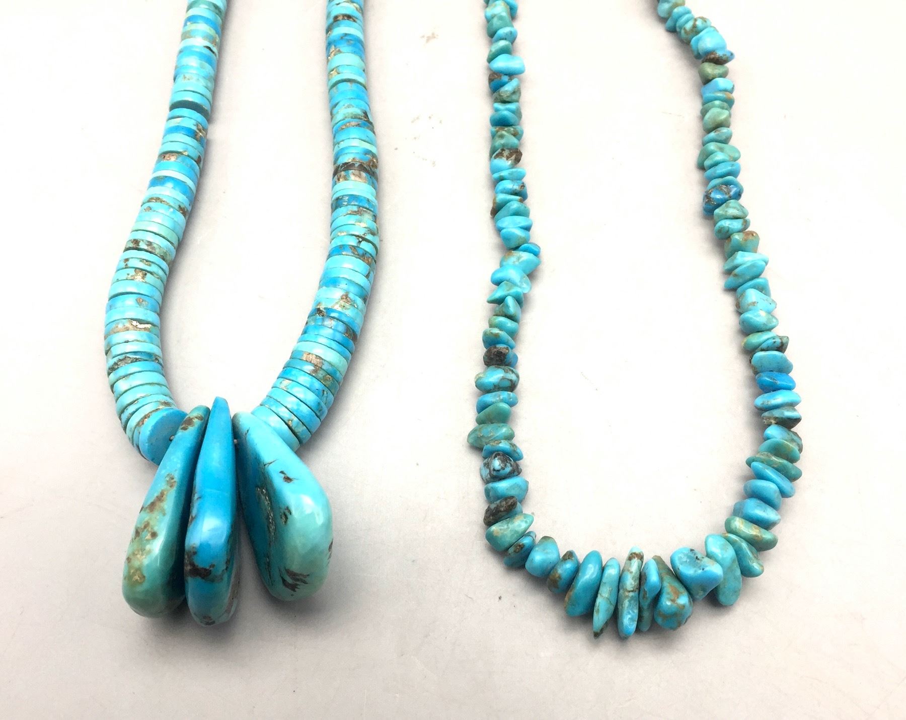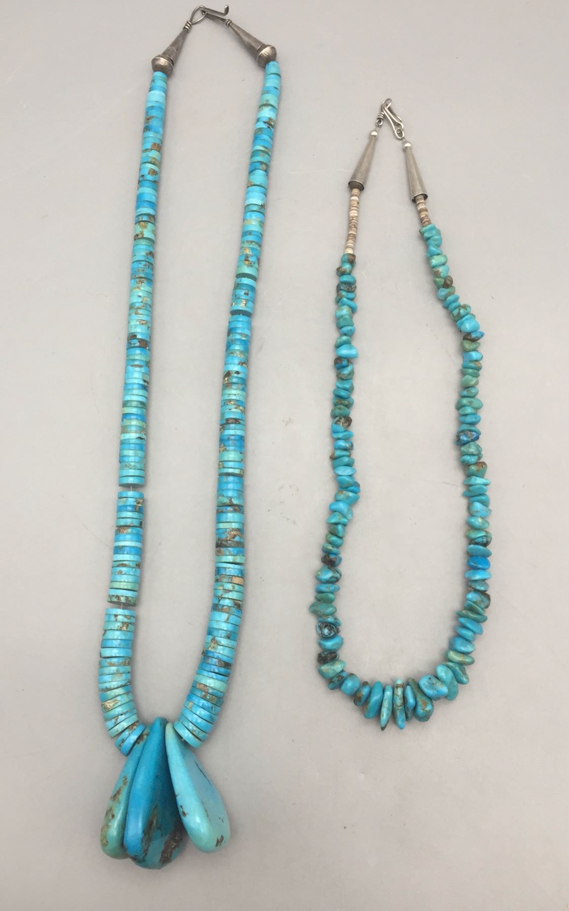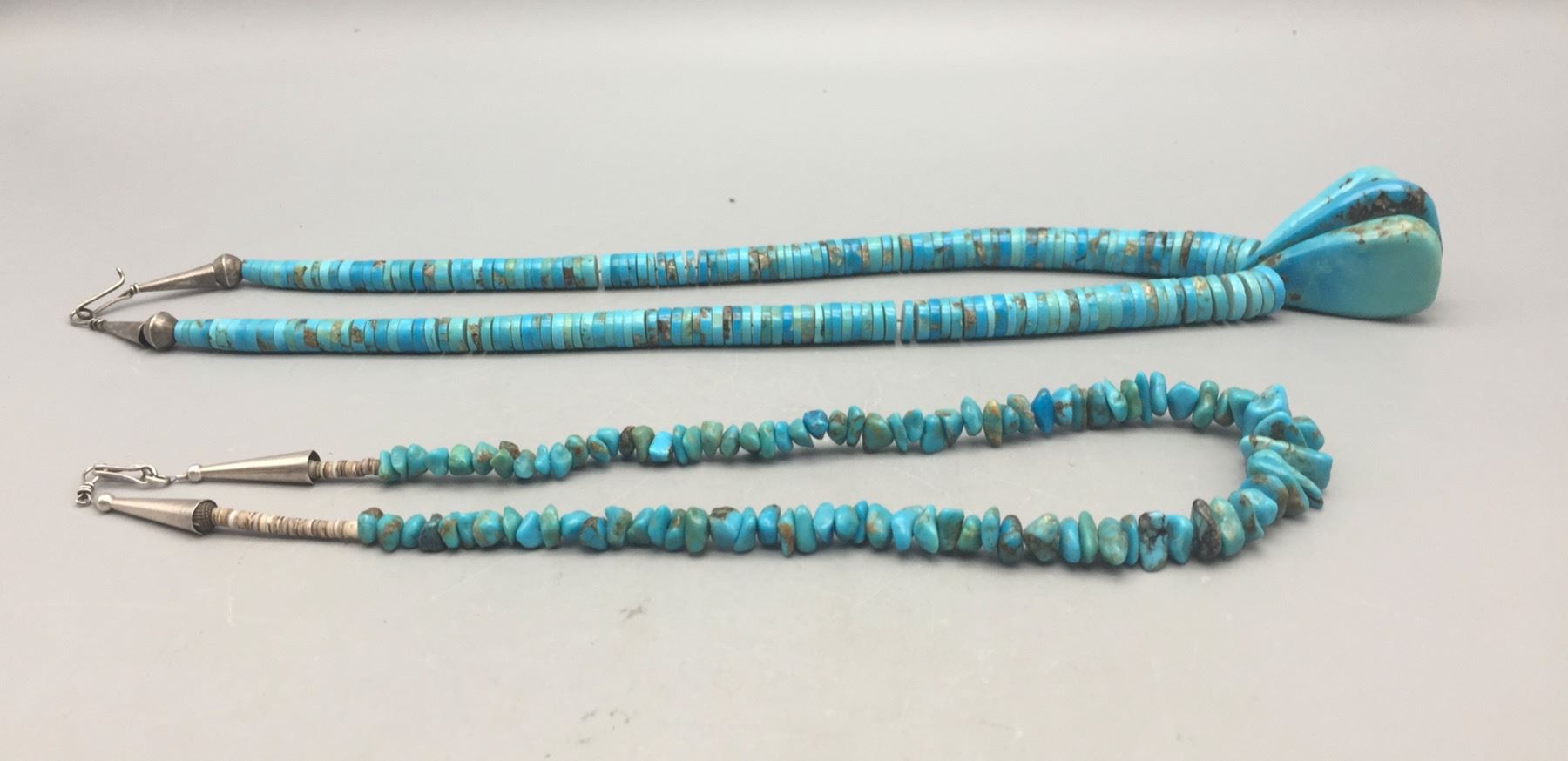 Description: Offered for sale in this lot we have two turquoise necklaces. Both are different styles and are strung with beautiful turquoise beads. Findings are sterling silver. Take a good look at the larger one, it is a nicer Pueblo style necklace. Maker: Various. Approx. Age: Vintage. Size: Various, Combined weight 212.2 grams. Condition: Good for their age, normal wear expected. Please look closely at the pictures - they are an important part of our description. Shipping: There will be a $5 handling / packaging fee for shipping this lot. The actual cost of postage will be added on top of that.