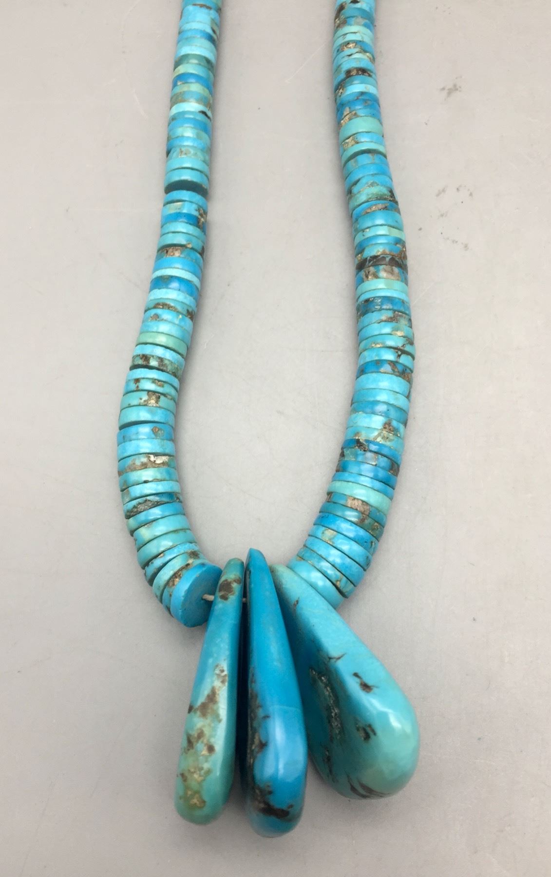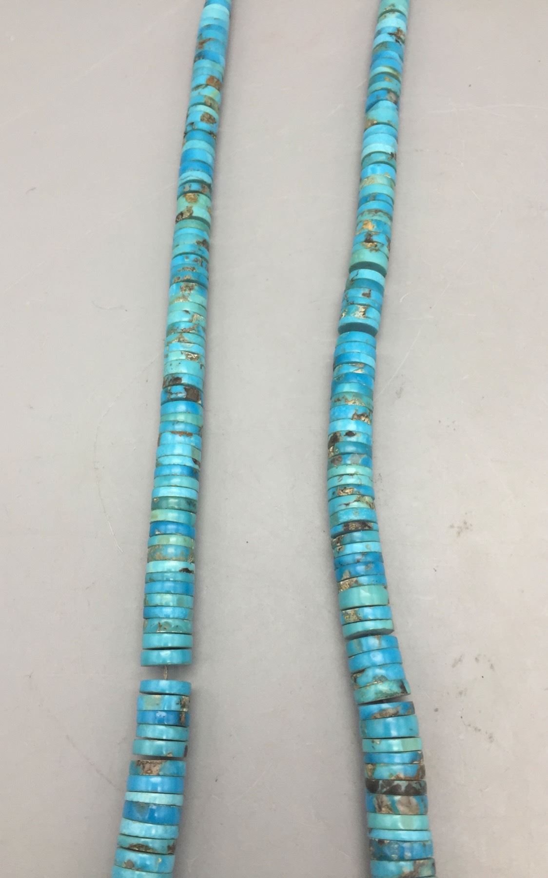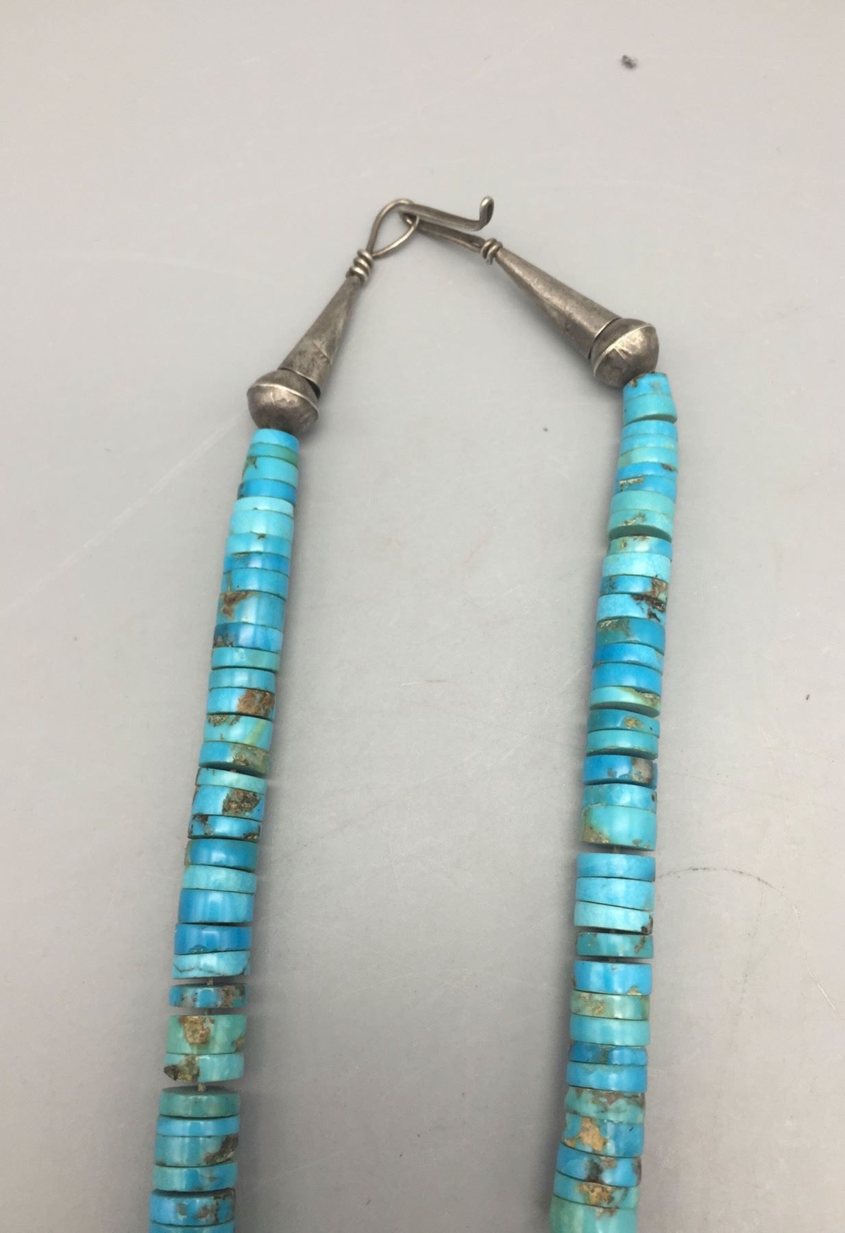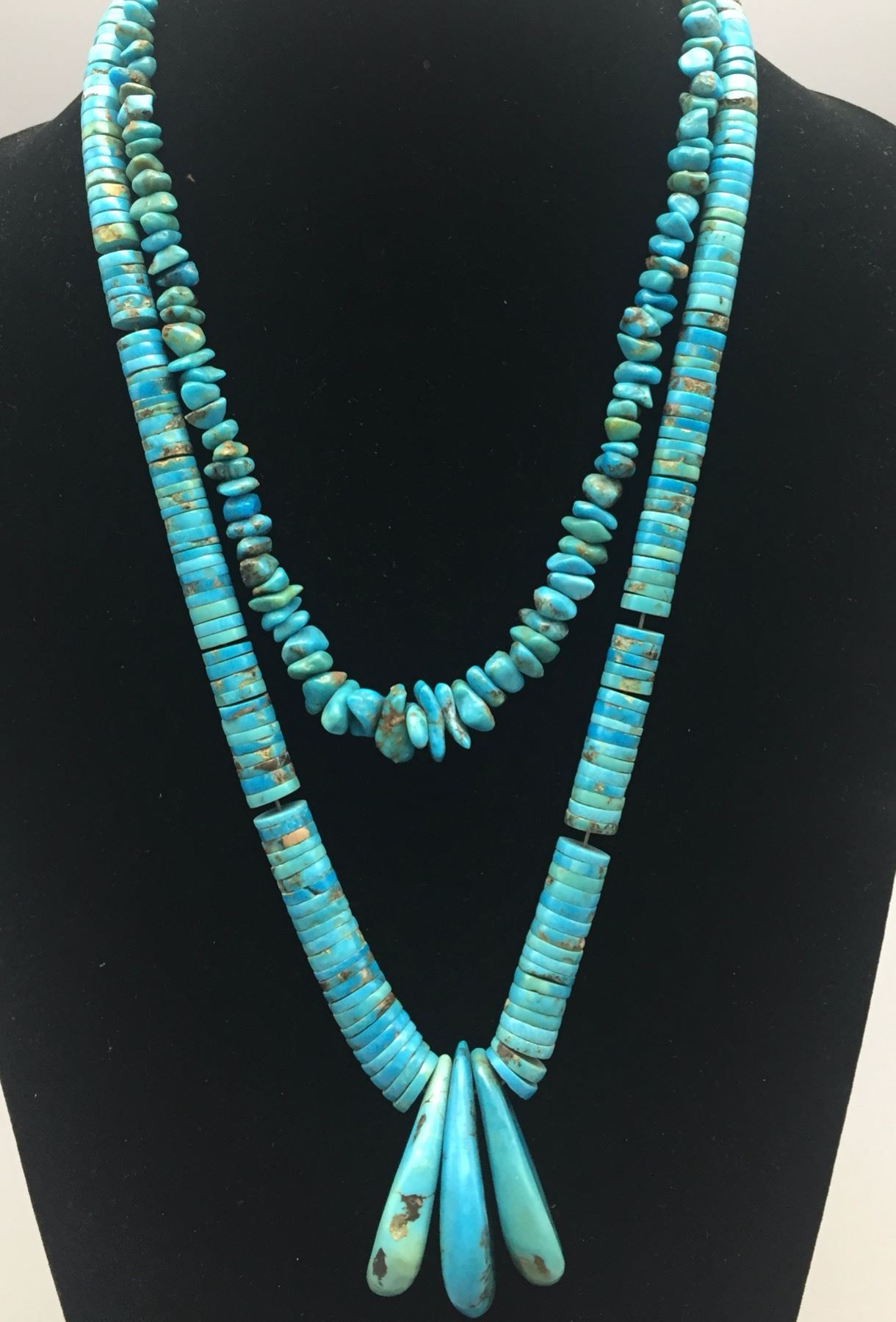 Description: Offered for sale in this lot we have two turquoise necklaces. Both are different styles and are strung with beautiful turquoise beads. Findings are sterling silver. Take a good look at the larger one, it is a nicer Pueblo style necklace. Maker: Various. Approx. Age: Vintage. Size: Various, Combined weight 212.2 grams. Condition: Good for their age, normal wear expected. Please look closely at the pictures - they are an important part of our description. Shipping: There will be a $5 handling / packaging fee for shipping this lot. The actual cost of postage will be added on top of that.