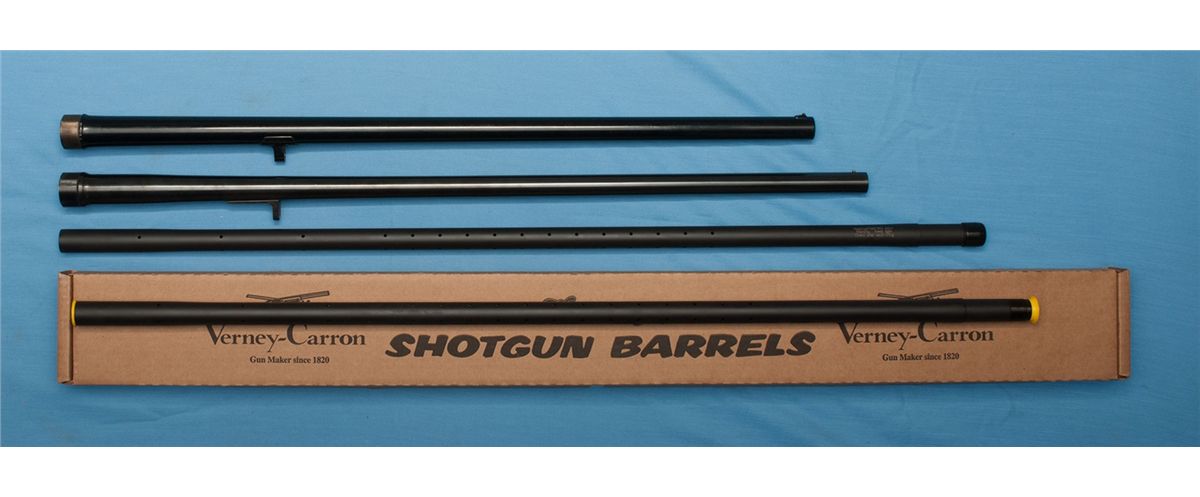 1) Winchester Model 50, 12 gauge, full choke, 30 inch round barrel with 2 ¾ inch chamber. 2) Winchester 12 gauge, modified 28 inch round barrel with 2 ¾ inch chamber. 3) Two Hastings 32 inch extension tubes for Browning Invector 12 gauge shotguns, one with a box. CONDITION: Fine to excellent overall.
