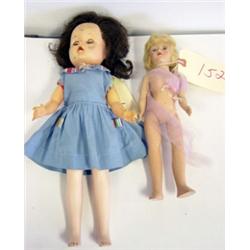 One doll is made of plastic with a soft face, moveable arms and legs, blue sleeping eyes and brown hair. She is approximately 14 inches. She is wearing a blue dress with multicolored pockets and collar She is in good condition. The second doll in this lot is approximately 10 inches. She is made of plastic and has blond hair with moveable head, arms, legs and fixed eyes. She is in good condition.