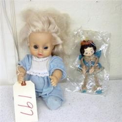 One doll is approximately 11 inches and is made of plastic. Her head, arms and legs are moveable and she has blue sleeping eyes. She has blond hair and is dressed in a blue and white sleeper. She is in good condition. The second doll is made of nylon covered covered cloth head and hands. The rest of her body is crochet and stiff. She is crocheted in blue and tan. She is approximately 6 inches and is in good condition.