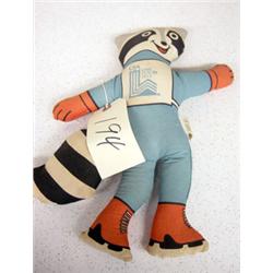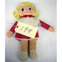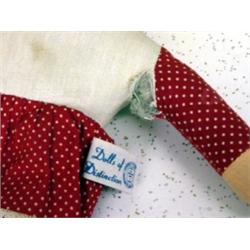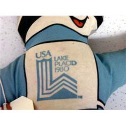 One doll is made by the Knickerbocker Toy Co., Inc. Dolls of Distinction. She is approximately 14 inches and she is stuffed with cotton. She is wearing a red and white poke-a-dot skirt with a white top, red collar and red and white poke-a-dot arms. She has yellow yarn hair. She needs some stitching on one arm but is in otherwise good condition. The second doll in this lot is an "Official Licensed Product 1980 Olympic Winter Games" doll. It was made by the Chase Bag. Co. of urethane foam and cellulose fibers. It is blue, orange and white and has USA Lake Placid 1980 on the front. It is in good condition.