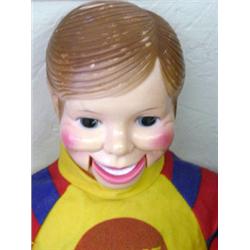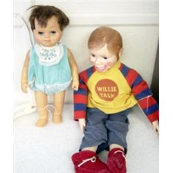 This 1962 Mattel Tiny Chatty Baby is approximately 14 inches. She is made of durable plastic and has a moveable head, arms, legs and eyes. She has short brown hair and is wearing a one piece blue sunsuit. She still talks and is in good condition. The second talking doll of this lot if a Horsman Doll, "Willie Talk" He is approximately 22 inches. He has a soft body with a plastic head and hands. He is wearing blue pants and a colorful yellow, red and blue whirt with matching red boots. He does not talk but is in otherwise good condition.