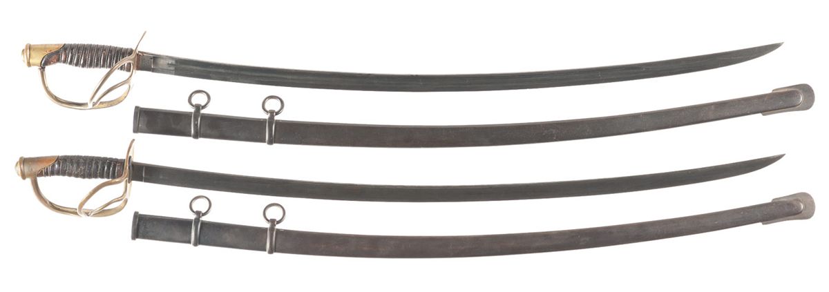 1) 35" blade with "C.E.W." inspection mark, metal scabbard. 2) C. Roby sword, 35" blade, metal scabbard. Wire wrap absent from #2, otherwise fair overall.
