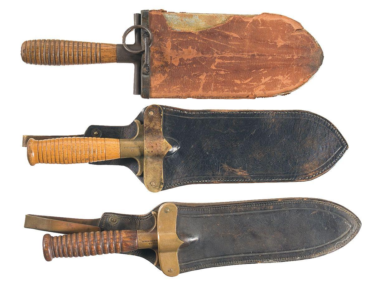 1) 1880 Entrenching Tool, 8 inch rounded spade tip blade with an upturned spine, bar cross guard, and ribbed wood grip marked "US", with a leather covered "US" stamped sheath. In fair condition, with part of the spine broken and absent, scattered spotting, pressure dents on the wood, and material loss at the edge of the sheath. 2) Springfield 1880 Hunting Knife, 8 1/2 inch blade with extra-wide single fullers, Springfield marked brass cross guard numbered "3924" ribbed grip and sheath with "RIA" stamped brass cartridge belt hook. Condition is very good, with spotting on the blade, chipping and dents on the grip, mild wear on the otherwise good leather and a dark patina on the brass. 3) Springfield 1880 Hunting Knife, as 2, with "513" numbered guard. Very good, with scattered light pitting, dings and wear. Sheath is fine.