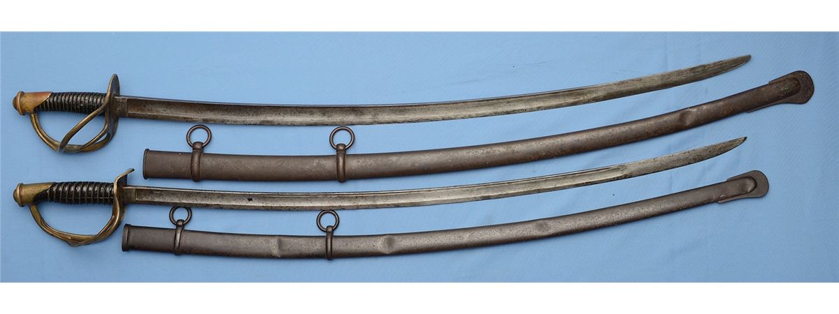 1) 35 1/2" blade with scabbard. 2) 35" blade with scabbard. CONDITION: 1) Fair as refurbished. 2) Fair, guard dented. Both scabbards dented.