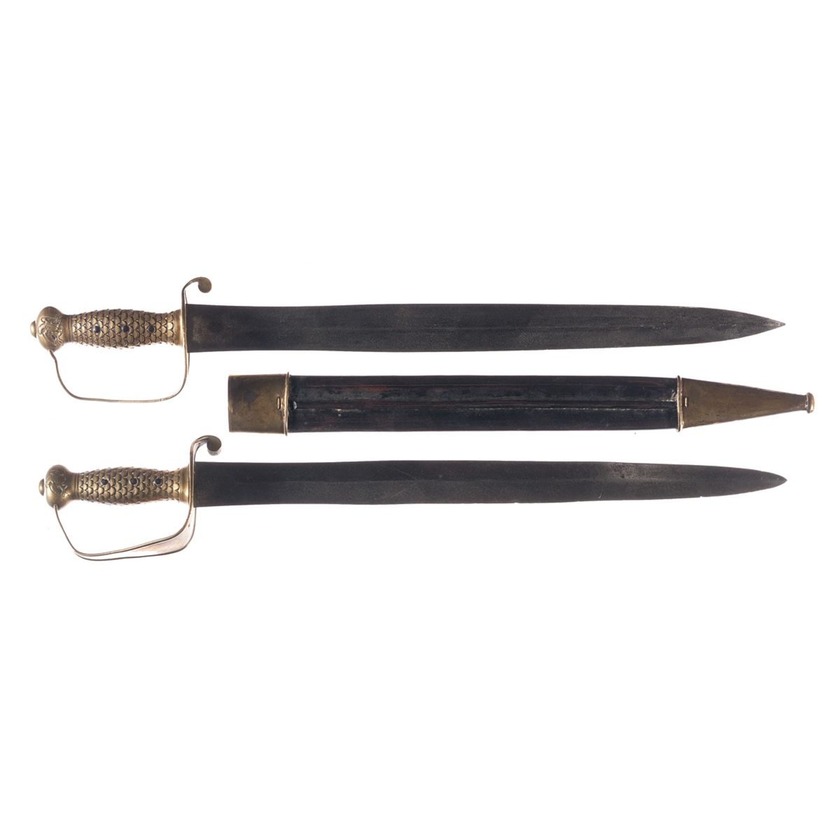 1) Ames sword, 21" blade, 1846 date, brass guard and grip, leather scabbard. Scabbard undersized. 2) As 1, 1842 date, minus sheath. Both are fair, with pitting.