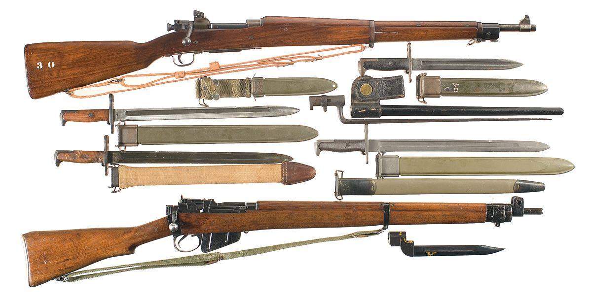 A) Blade and peep sights, with "9-43" dated Remington barrel, standard receiver markings, smooth stock with slightly altered grip profile, checkered buttplate and brown leather sling, with a 1943 dated PAL knife bayonet with 10" blade and sheath. Also included are 4 extra U.S. bayonets and six sheaths, all in fair or better condition.