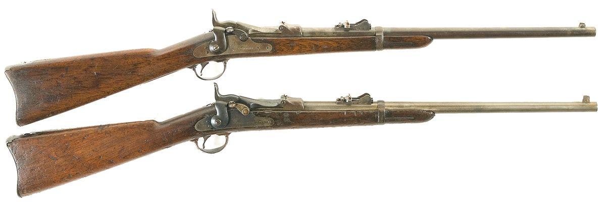 A) Manufactured between 1877 and 1878 with breechblock dated "1873". Buttplate tang stamped "US" with "B/9" stamped on top of buttstock. Complete with saddle ring and bar on left side of stock.