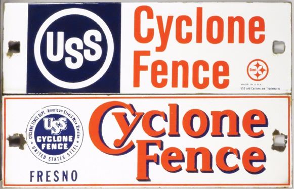 Two USS Cyclone Fence Porcelain Signs. One for Fresno, chips at grommets otherwise good condition. 13 1/4 X 4 1/4 inches.