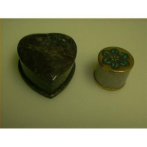Two Unique Jade Boxes. One is dark color heart shape, and has a stamp saying India and some other stuff, cannot make it out. Very beautiful one, and is 3" Diam and 1.5" H. The other one has a jade and has a Brass base, and lid with hand painted flowers with a #200 on it. It is 1.5" Diam and 1.5" H. They are very nice and can be used for many things. Great condition, and make great gift items also. Hope you like them.
