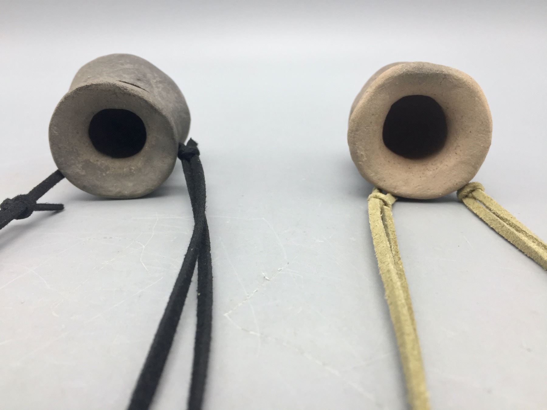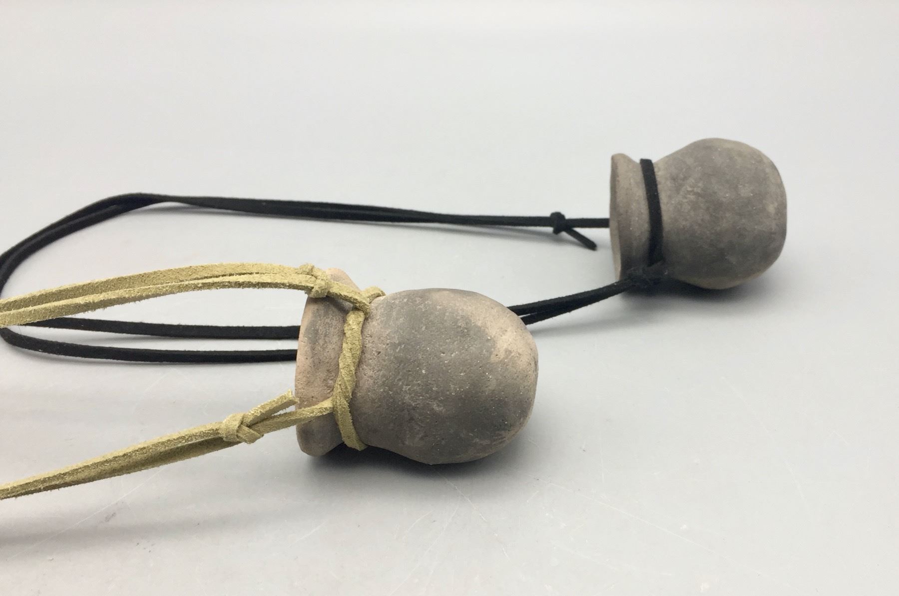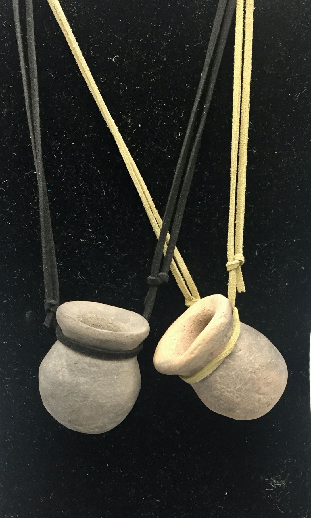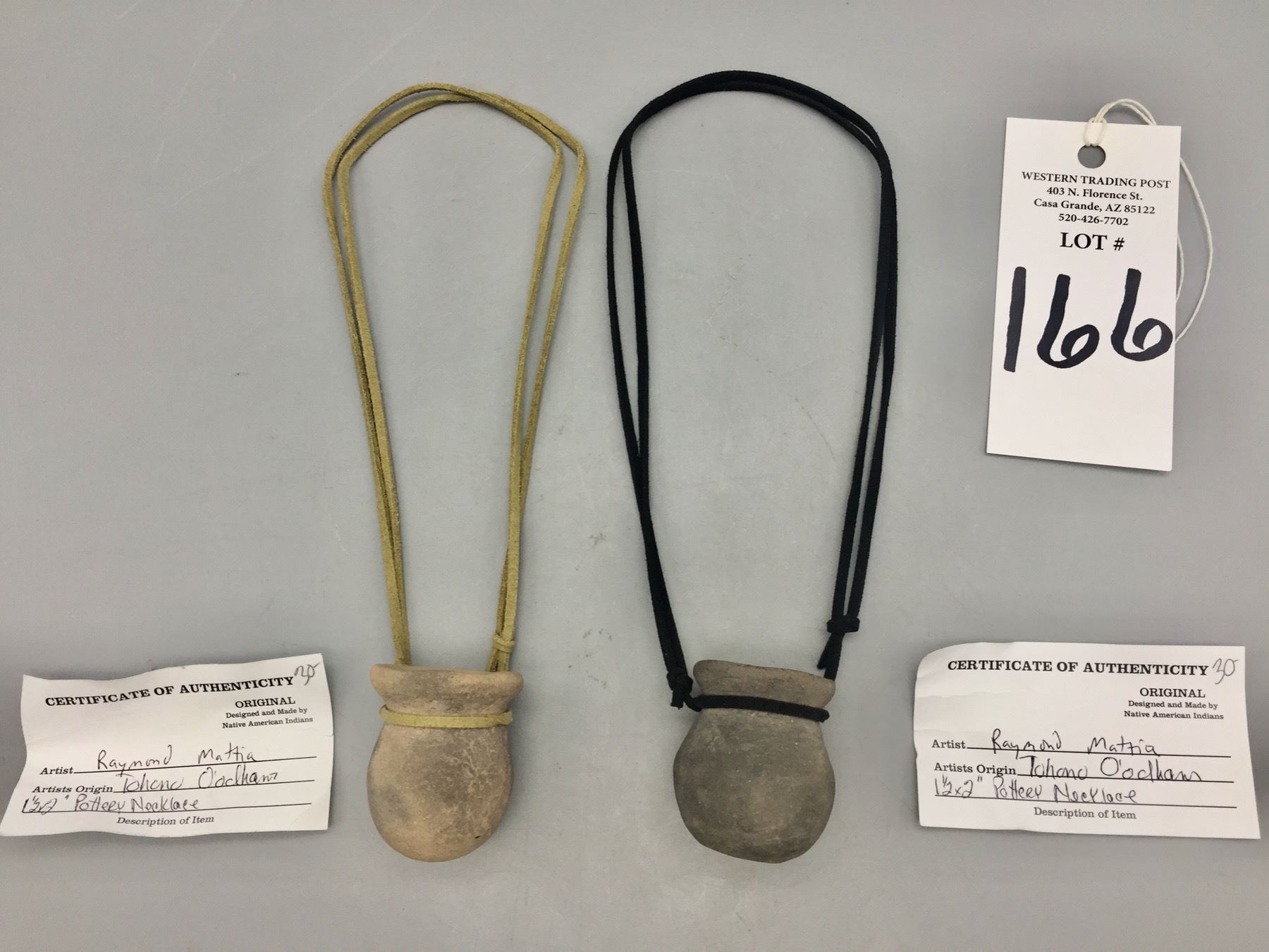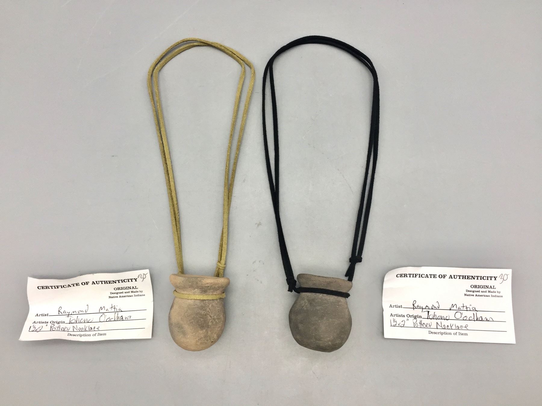 Description: Offered for sale in this lot are two unique Tohono O’Odham pottery necklaces, strung on leather cords. Maker: Raymond Mattia, Tohono O’Odham. Approx. Age: New. Size: adjustable cords. Combined weight is 119.1 grams. Condition: Good. Please look closely at the pictures - they are an important part of our description. Shipping: There will be a $5 handling / packaging fee for shipping this lot. The actual cost of postage will be added on top of that.