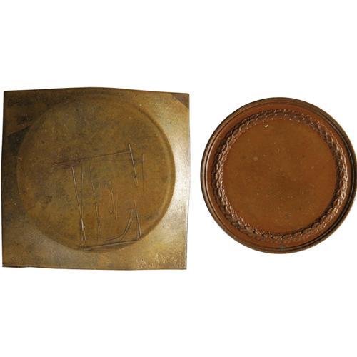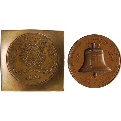<B>Two Important Unlisted Centennial Exposition So-Called Dollars.</B></I> HK 24A Liberty Bell obverse identical to HK 24 reverse field - previously unknown (bronze-UNC); HK61A trial strike of the reverse of HK 61. A star in a field of rays on a thin square piece of copper, a large E double struck on reverse (bronze-UNC). Both previously unknown. 2 pieces.