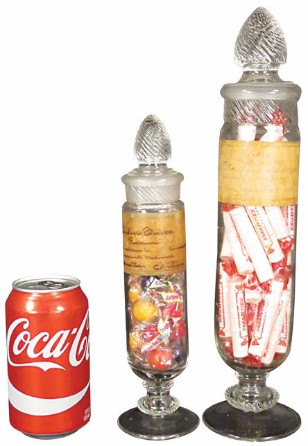 Two Small Columbia Cylinder Candy Jars. 13 inch jar has small chip on ground glass stopper, 10 inch jar has small chip on ground glass stopper.